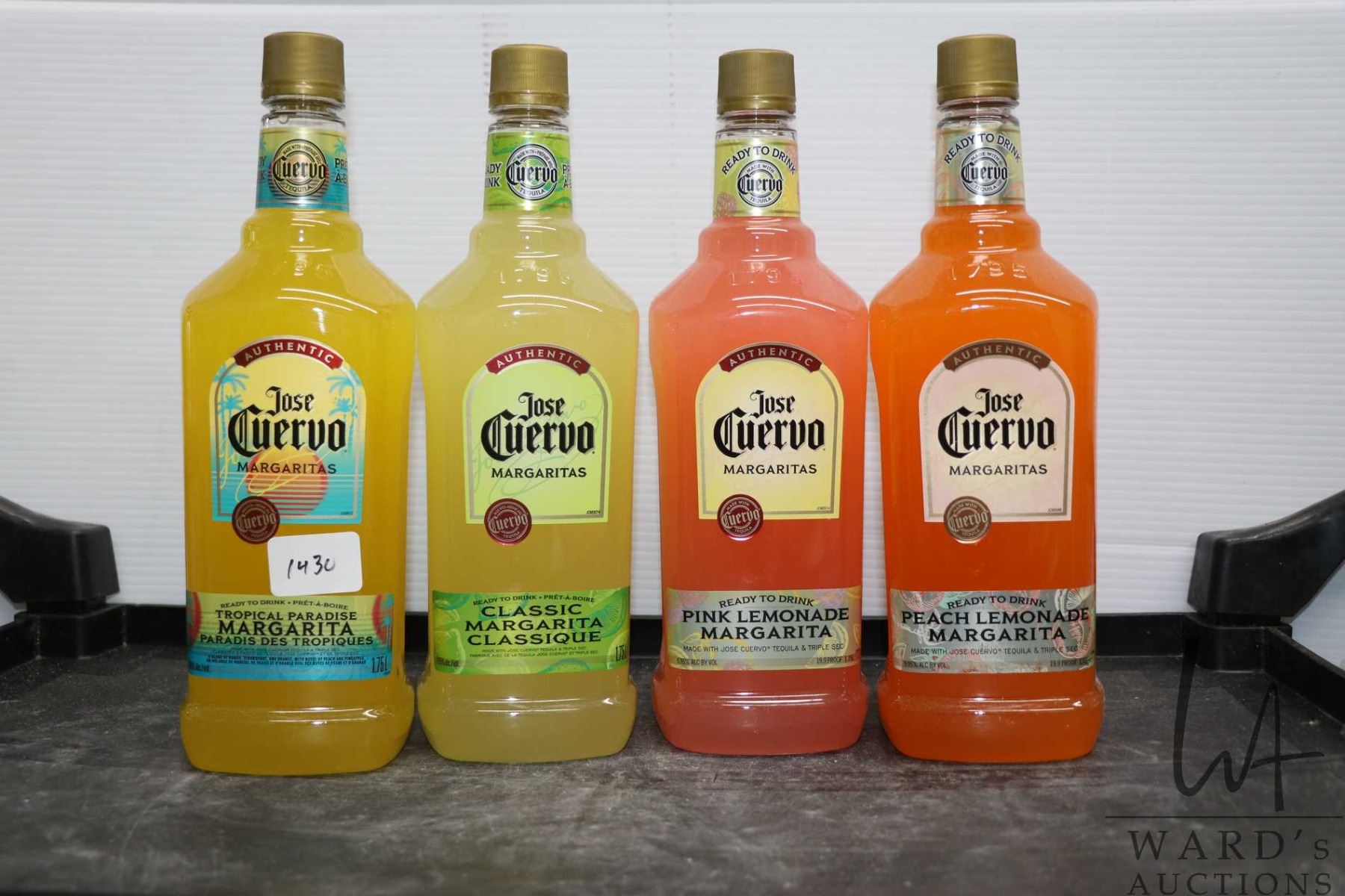 Four 1.75 L Jose Cuervo Margaritas in assorted flavors including Tropical Paradise, Classic, Pink Lemonade and Peach Lemonade. All 9.95% ABV Note: Alcohol cannot be insured by any courier in Canada. Local pick up is recommended. Canadian bidders only