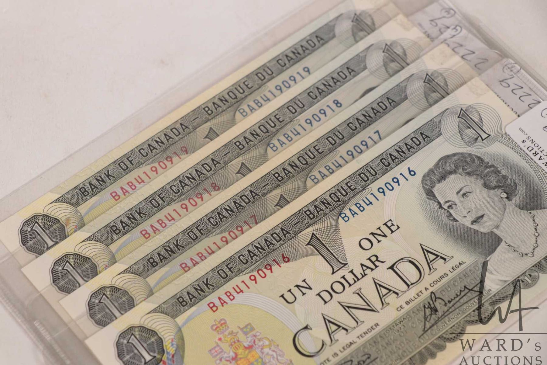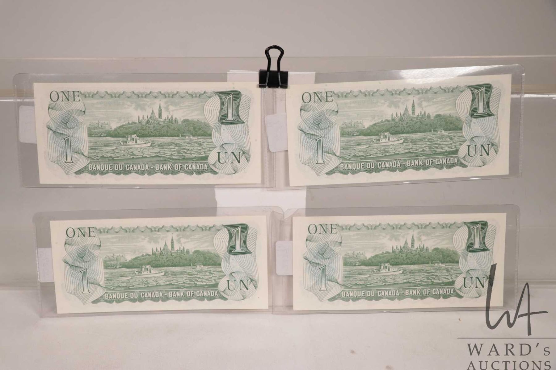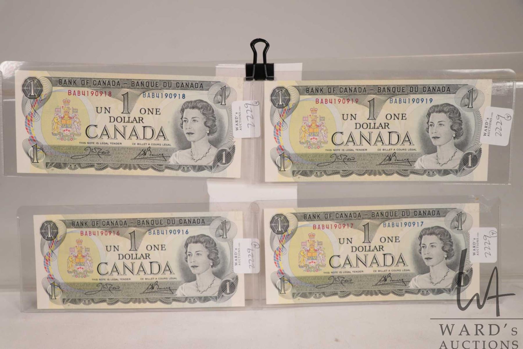 Four 1973 Canadian $1 bills with consecutive serial numbers