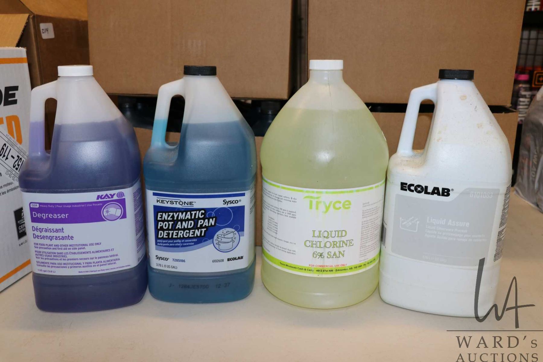 Four 3.8 L containers of industrial cleaner including Kay de-greaser, Keystone Enzymatic pot and pan detergent, Tryce liquid chlorine and Ecolab liquid assure