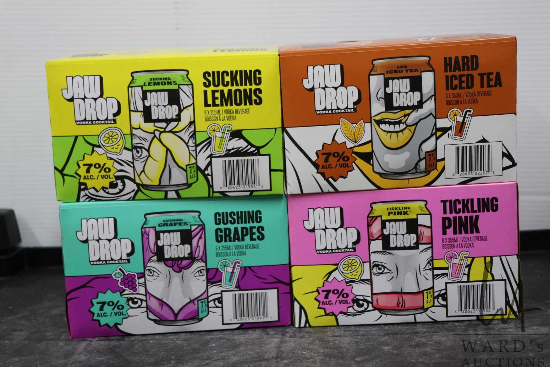 Four 6 packs of Jaw Drop Vodka Cocktail cans including one Sucking Lemons 6 x 355ml/ 7.0% ABV, one Hard Iced Tea 6 x 355 ml/ 7.0% ABV, one Gushing Grapes 6 x 355ml/ 7.0% ABV and one Tickling Pink 6 x 355ml/ 7.0% ABV Note: Alcohol cannot be insured by any courier in Canada. Local pick up is recommended. Canadian bidders only