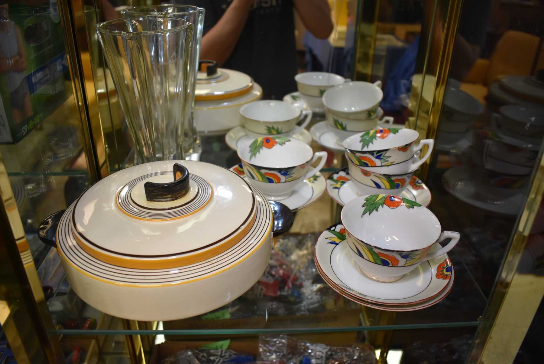 Four Art deco hand painted cups and saucers, Art deco vase and a Royal Doulton lidded "Marquis" covered casserole dish