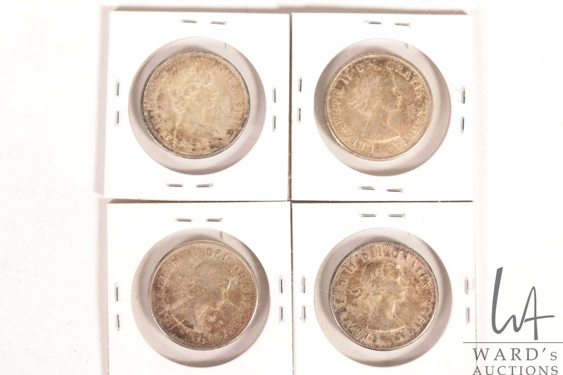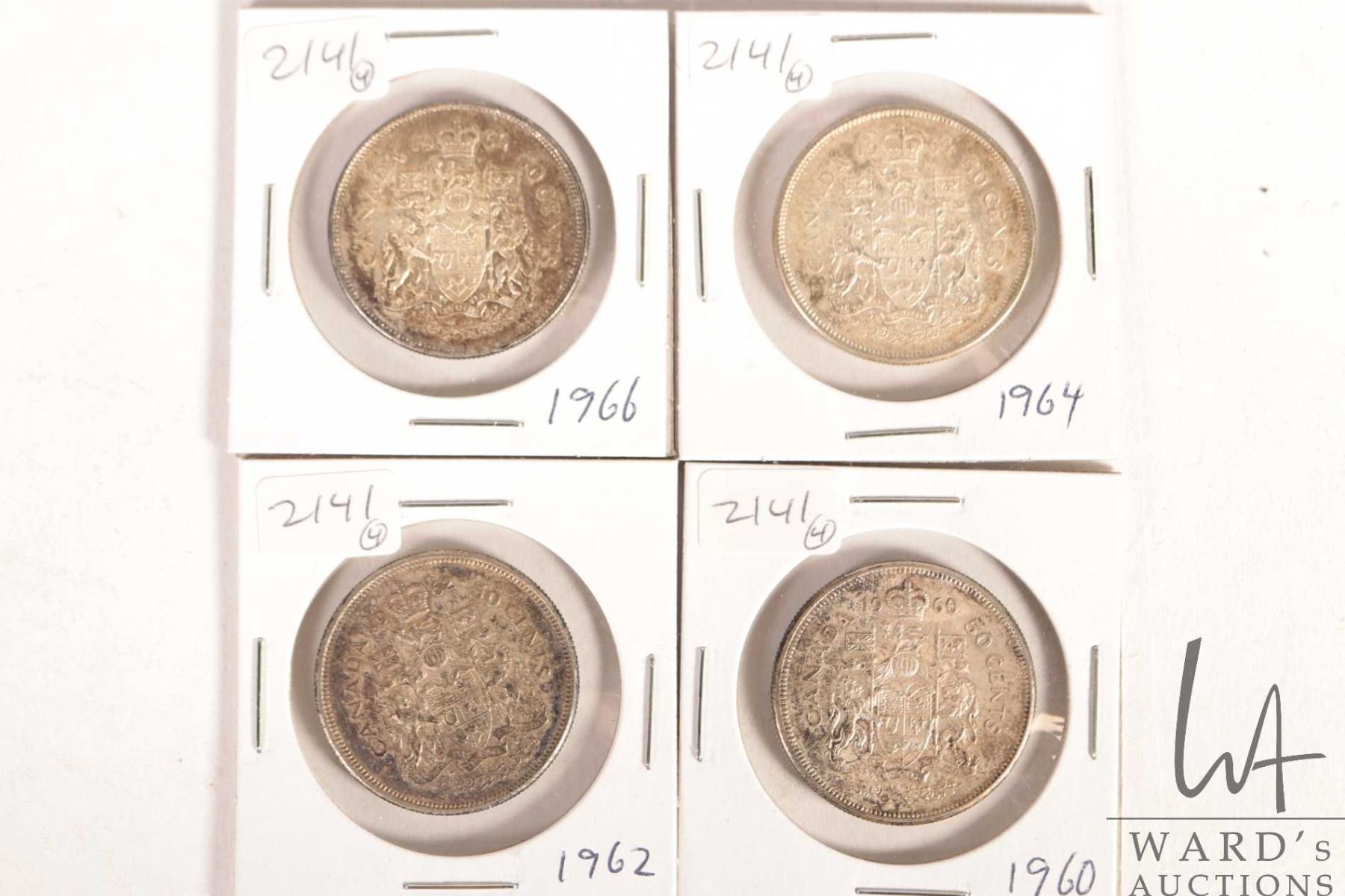 Four Canadian 50 cent coins including 1960, 1962, 1964 and 1966