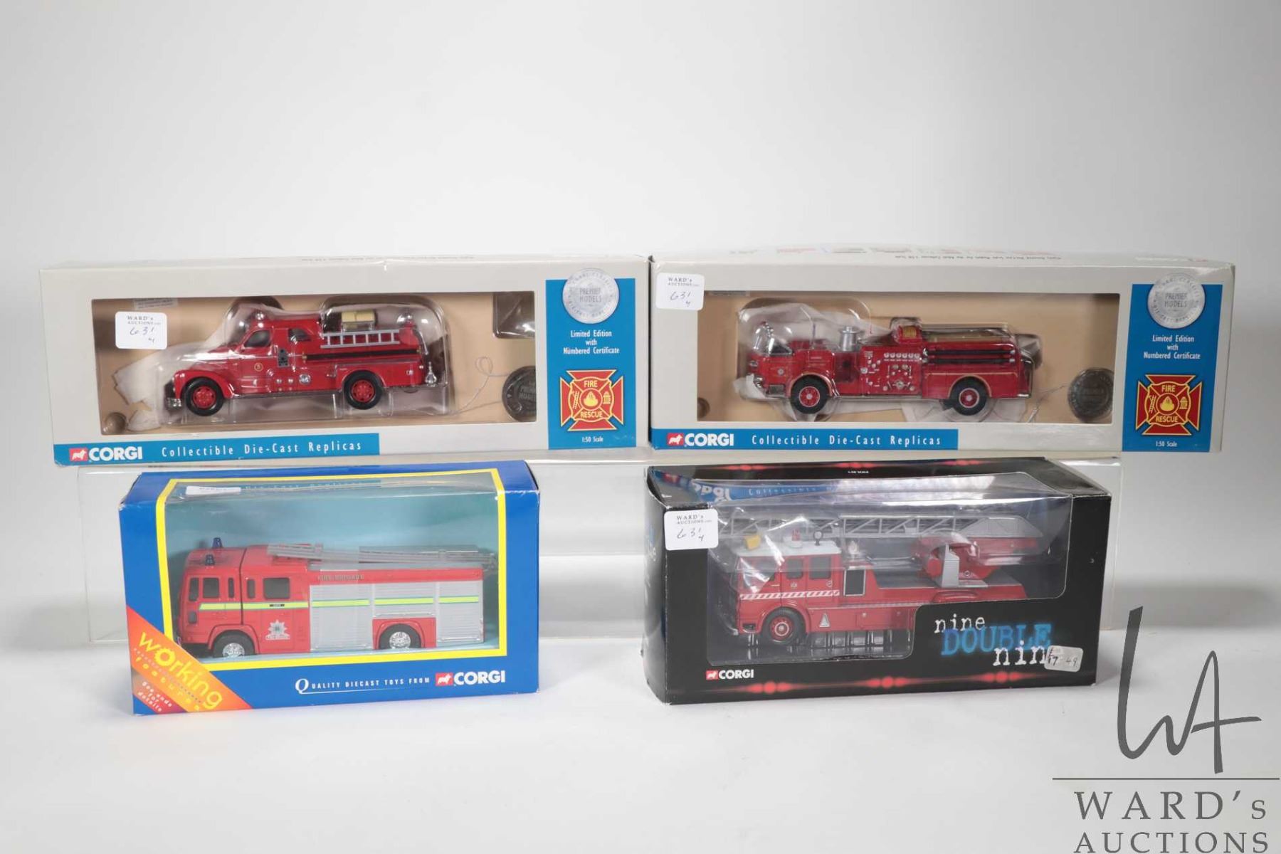 Four Corgi die-cast 1:50 scale fire engines with original boxes