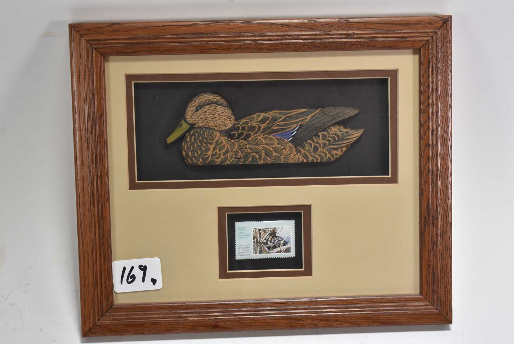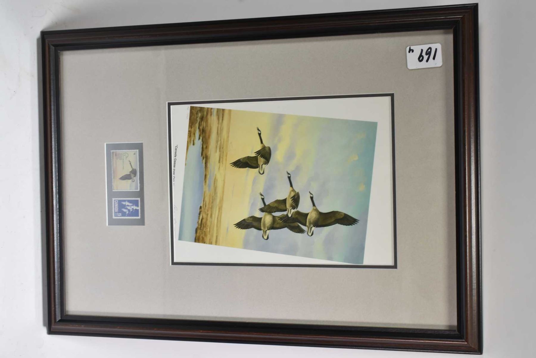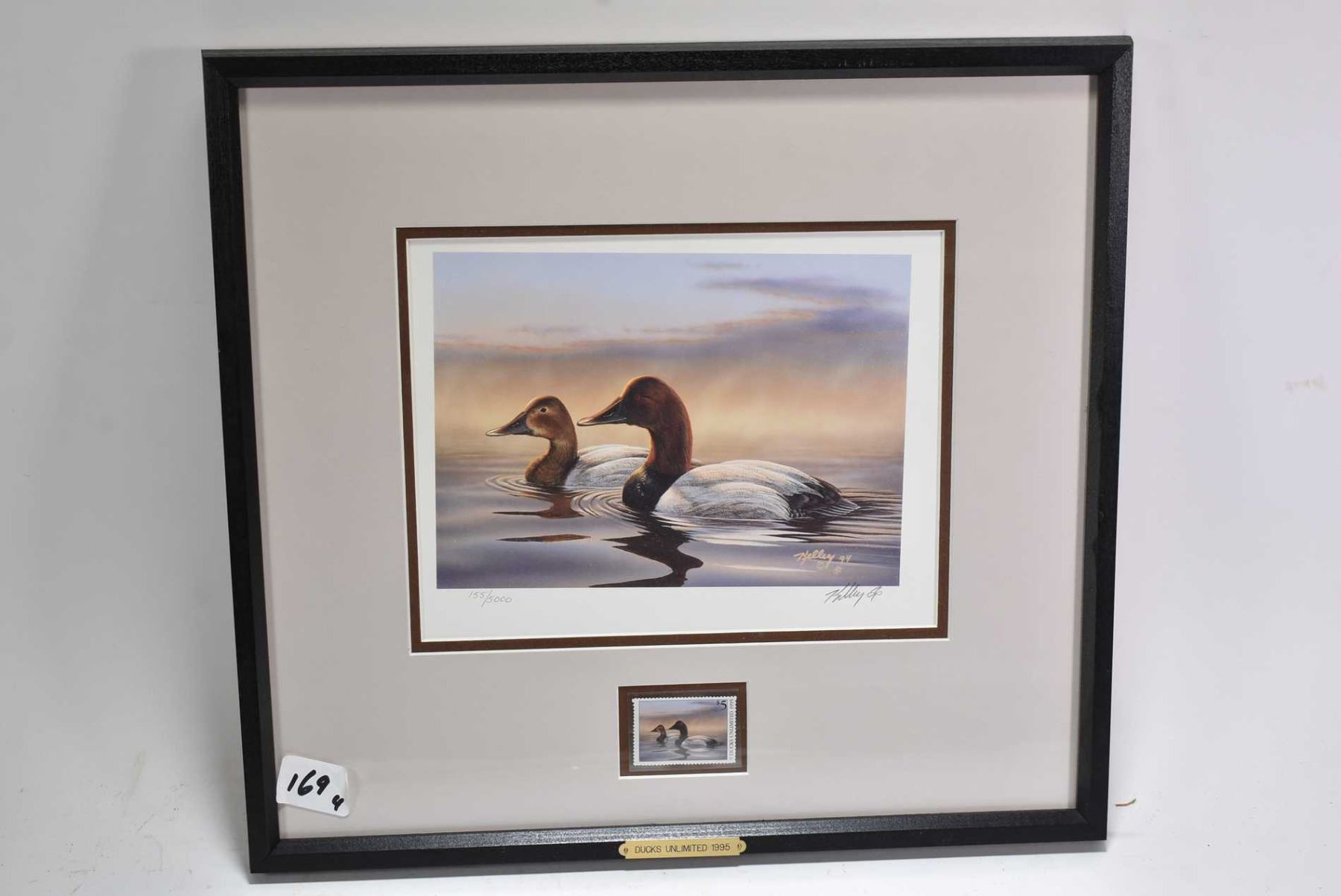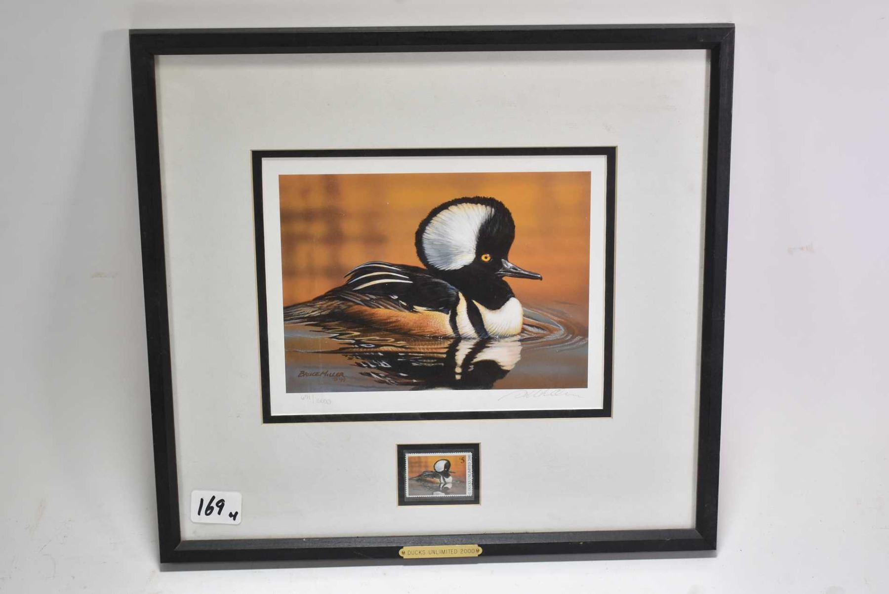 Four Ducks Unlimited prints with stamps including untitled Bruce Miller duck picture 671/5000, Canada Goose print and stamp by Angus Shorll 461/950, plus a pair of ducks by Rick Kelley 155/5000 and an unsigned and framed "carving" of a duck