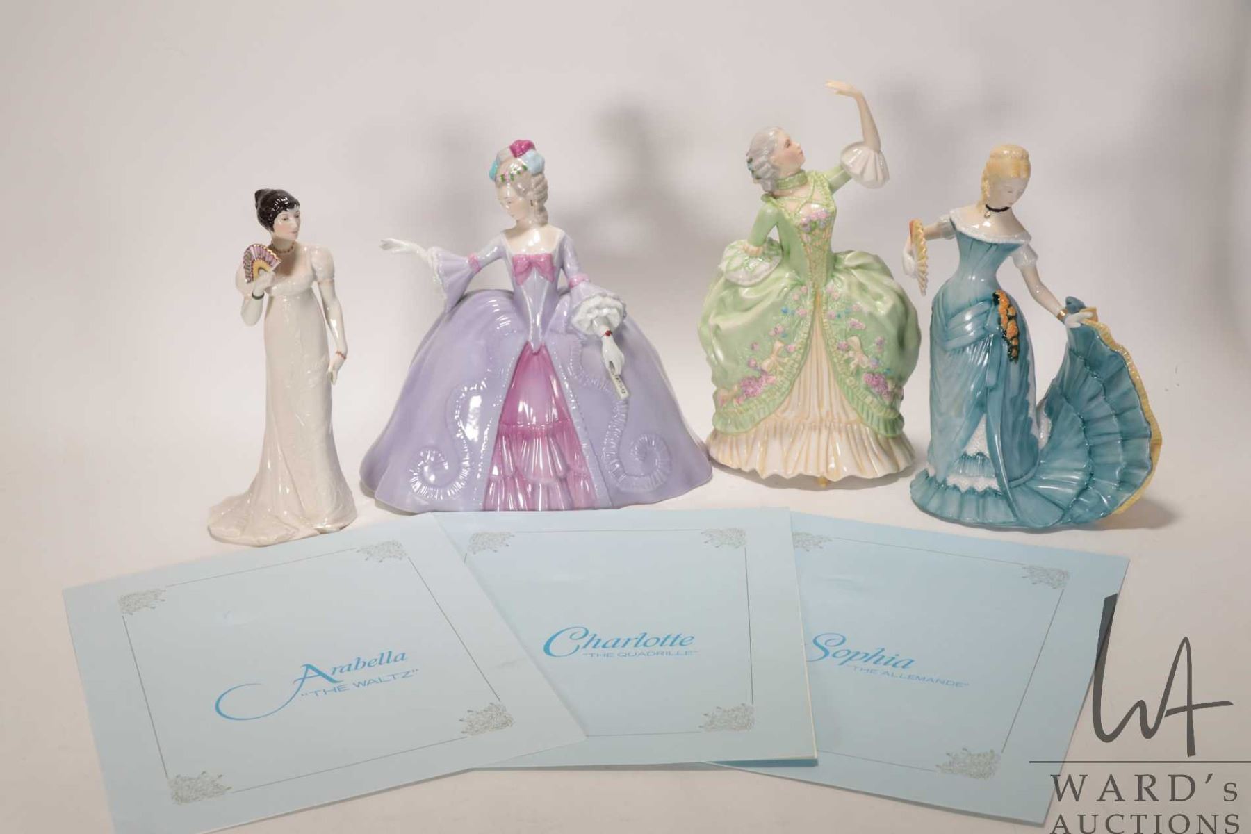 Four Franklin Mint figurines including "Sophia-Allenmande", "Charlotte- The Quardille", "Arabella-The Waltz" and Marianne- The Minuet"
