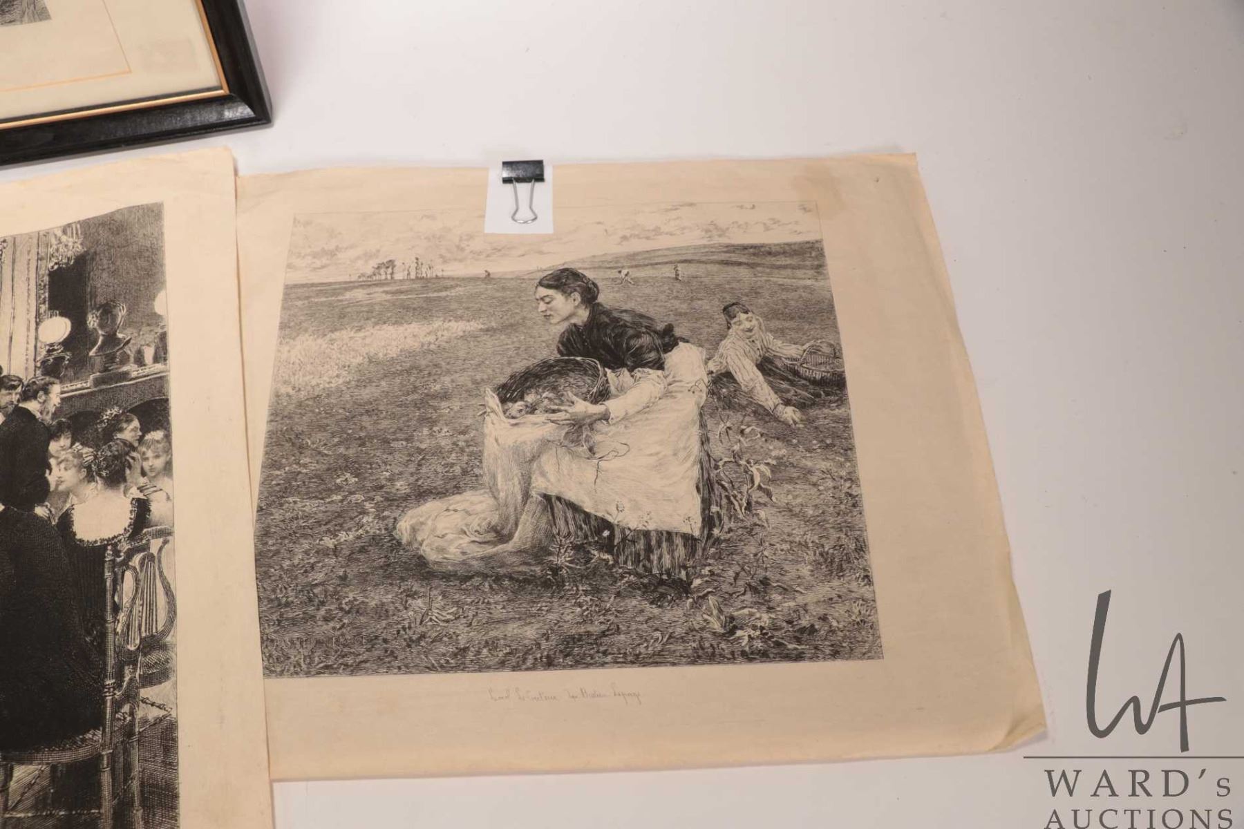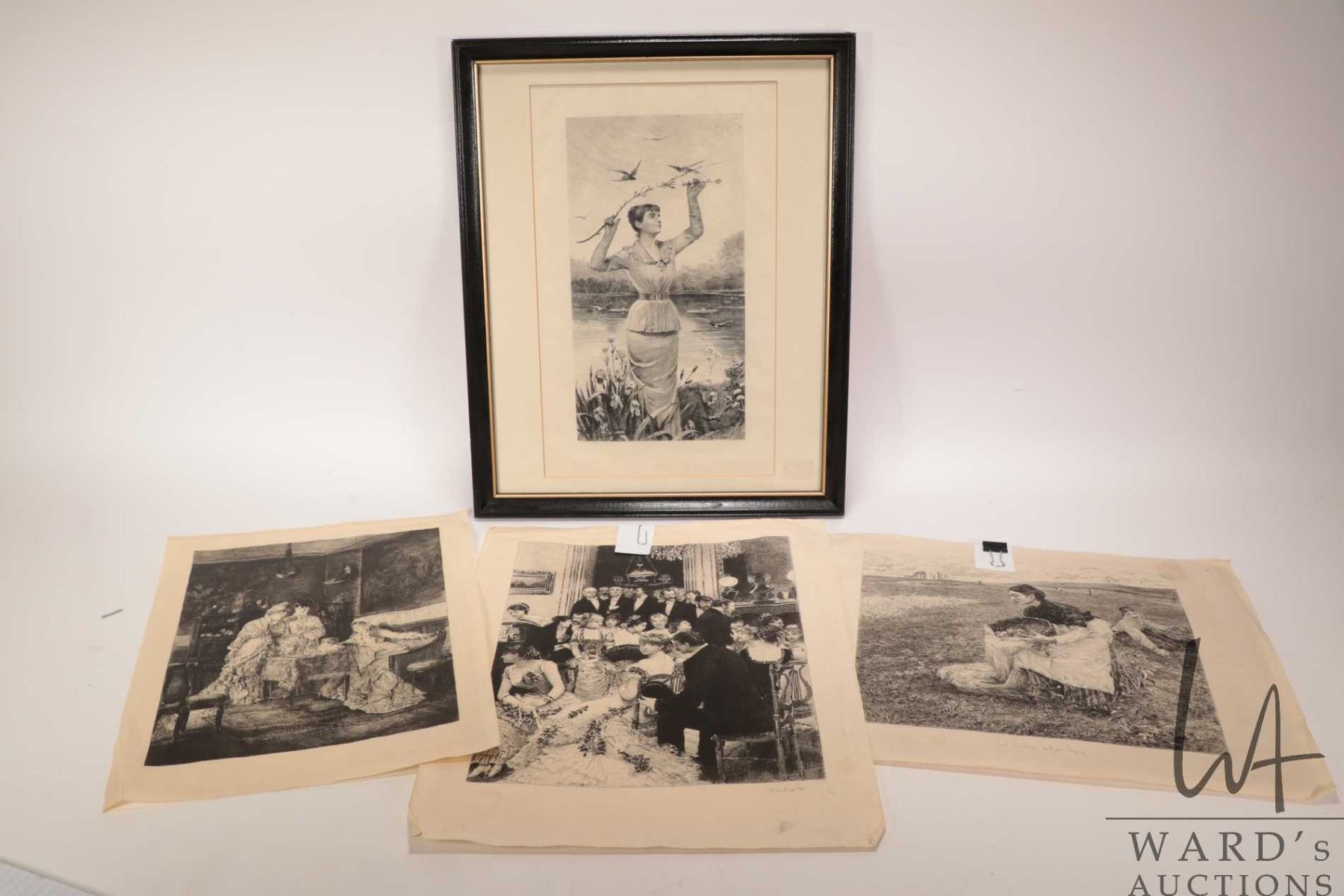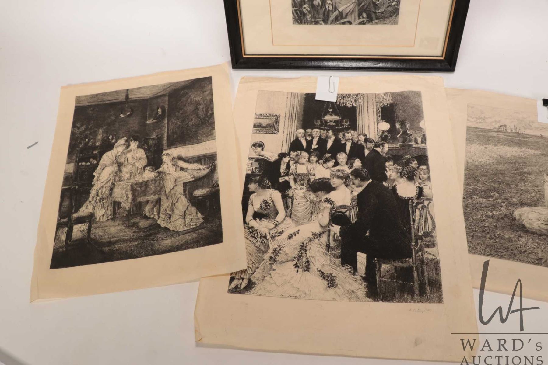 Four French etched prints including one framed and three unframed, all appear to be circa 1880's time frame
