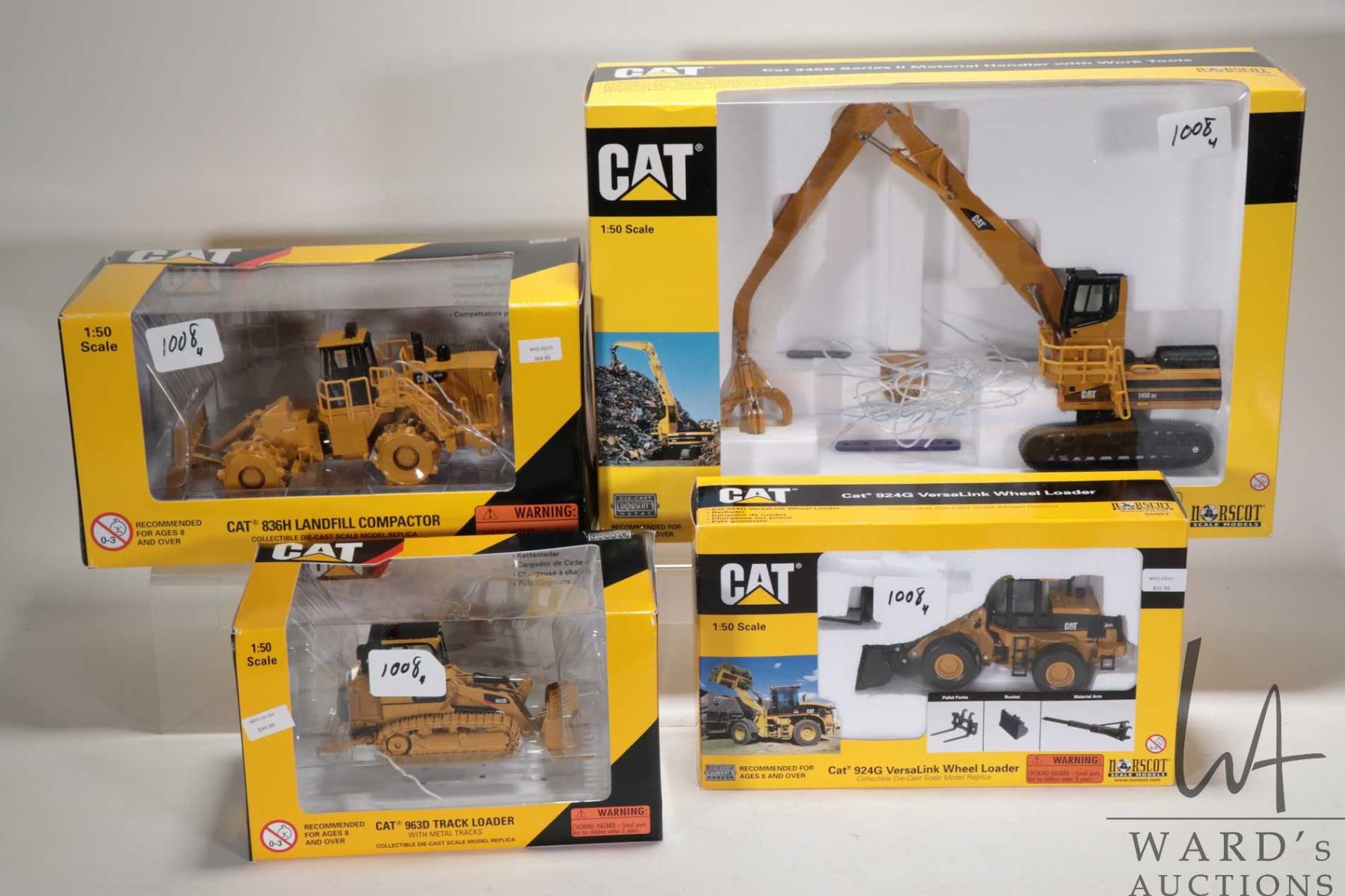 Four Norscot 1:50 scale die cast CAT including 345B Series II Material Handler with Work Tools, 836H Landfill Compactor, 963D Track Loader with Metal Tracks and 924G VersaLink Wheel Loader, each includes box and each has been previously removed and displayed