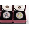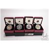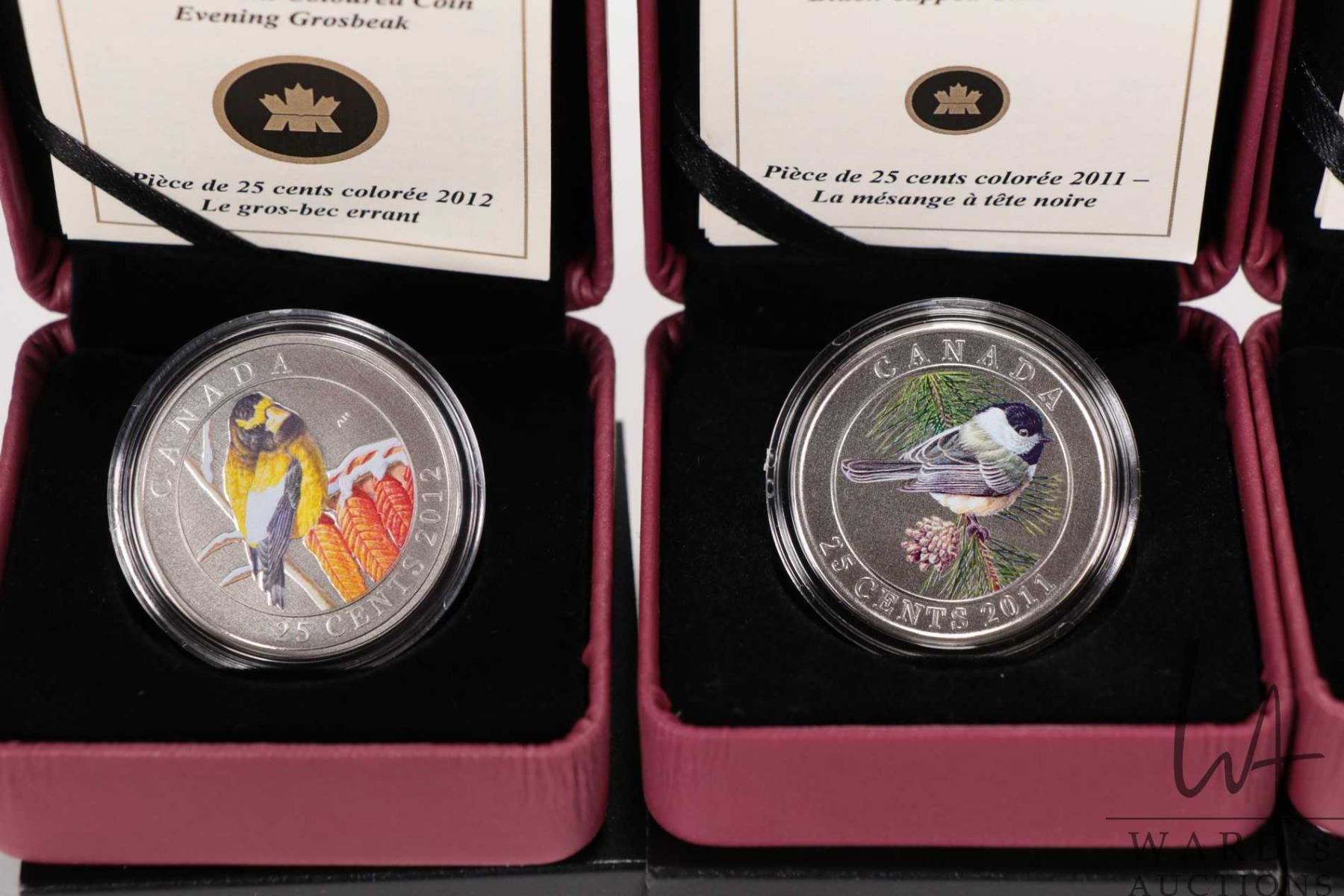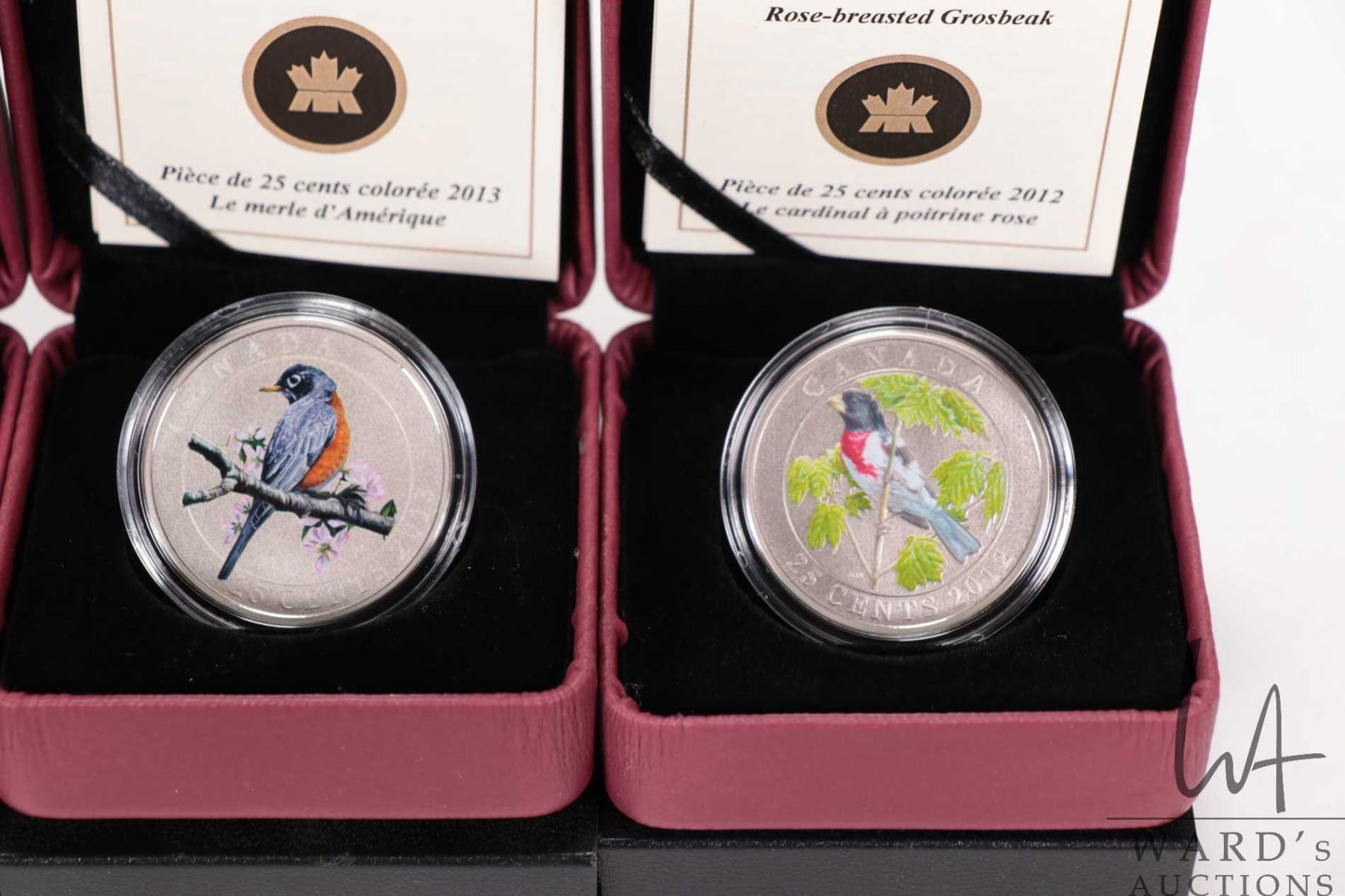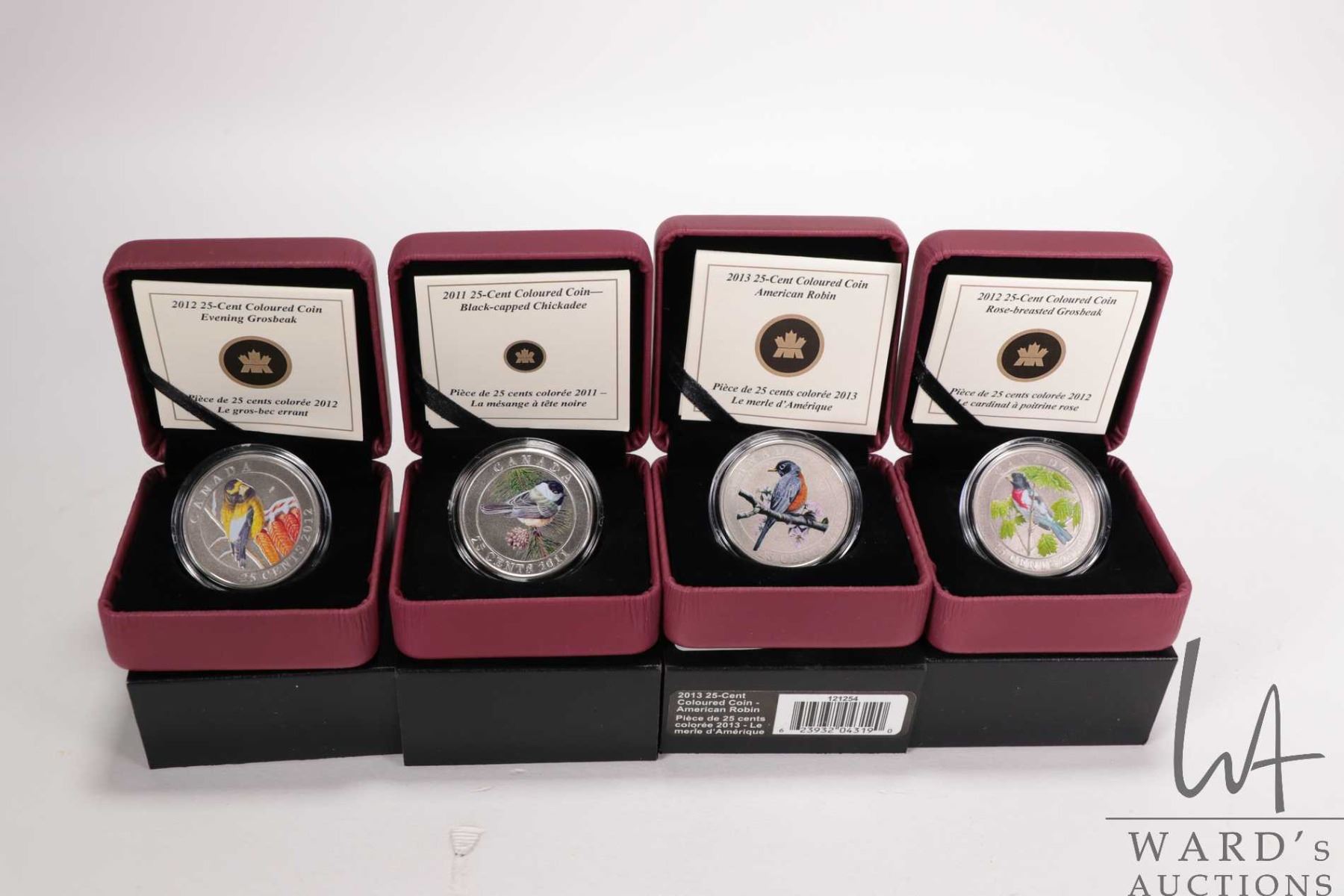 Four Royal Canadian Mint boxed collector 25 cent coloured coins including 2011 Black-capped Chickadee, 2012 Evening Grosbeak, 2012 Rose-breasted Grosbeak and a 2013 American Robin