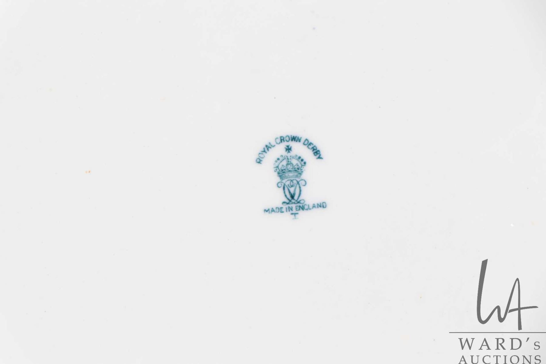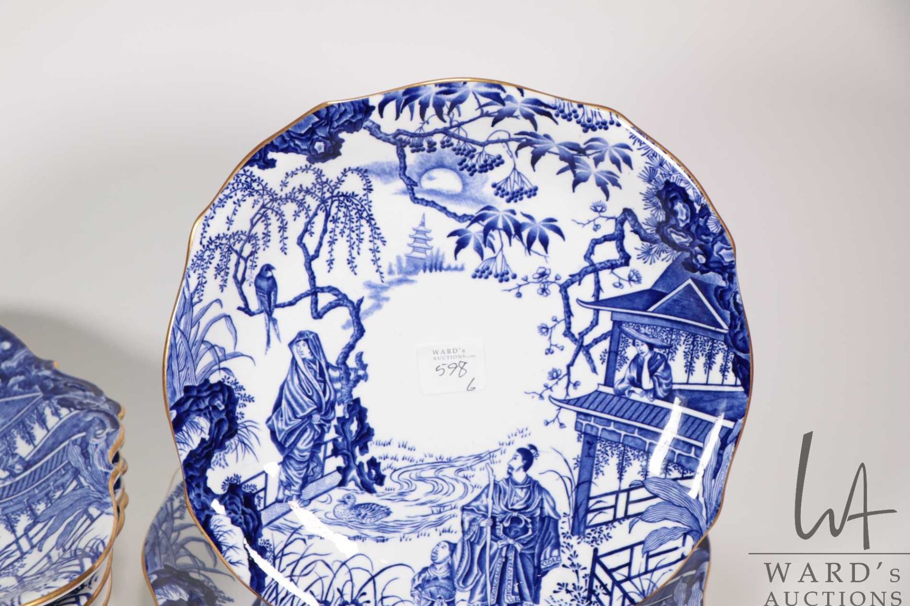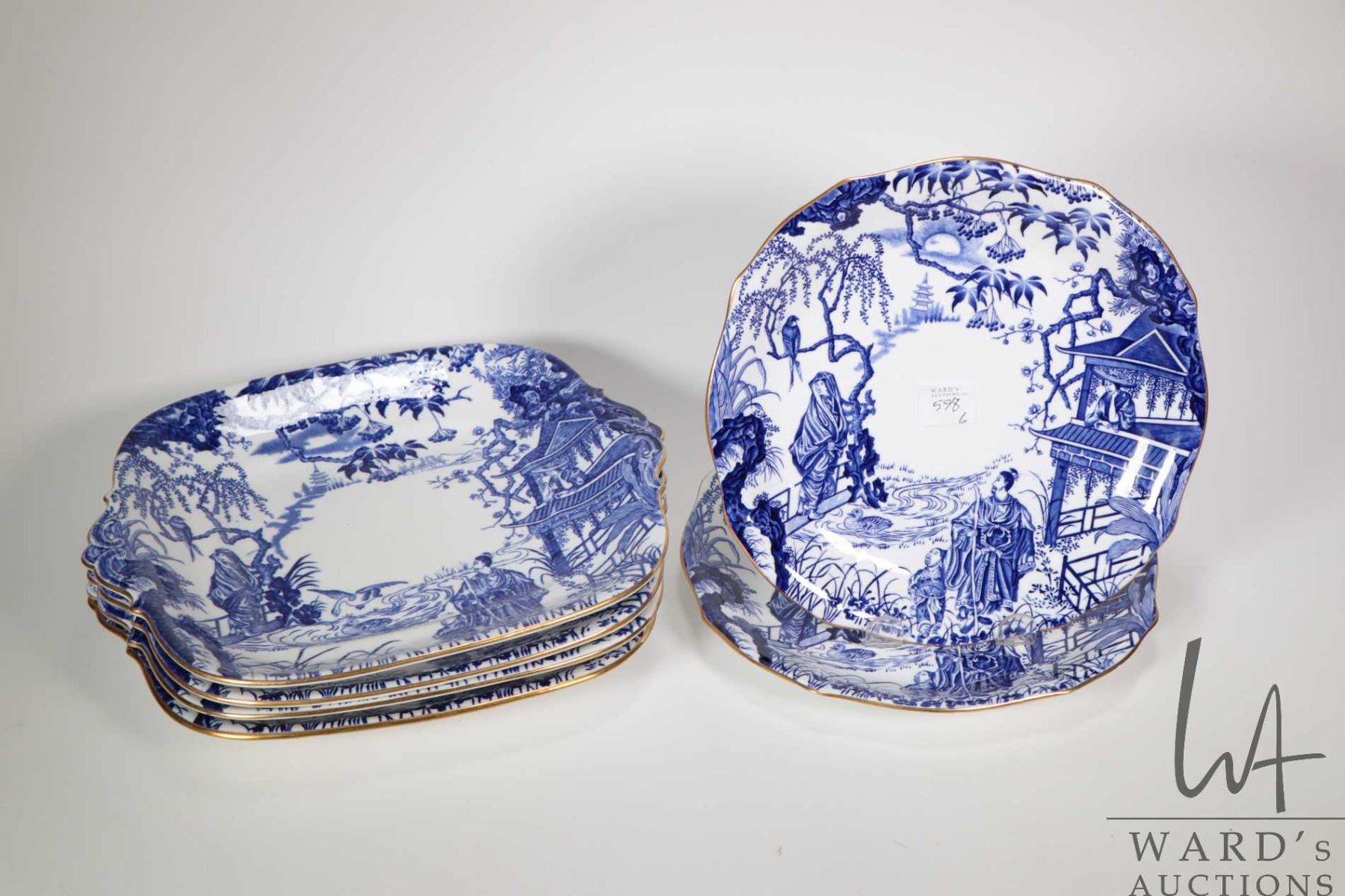 Four Royal Crown Derby "Mikado" bone china, double handled serving plates, each 9 1/4" square and two 8 3/4" round plates. Note: Not available for shipping. Local pickup only