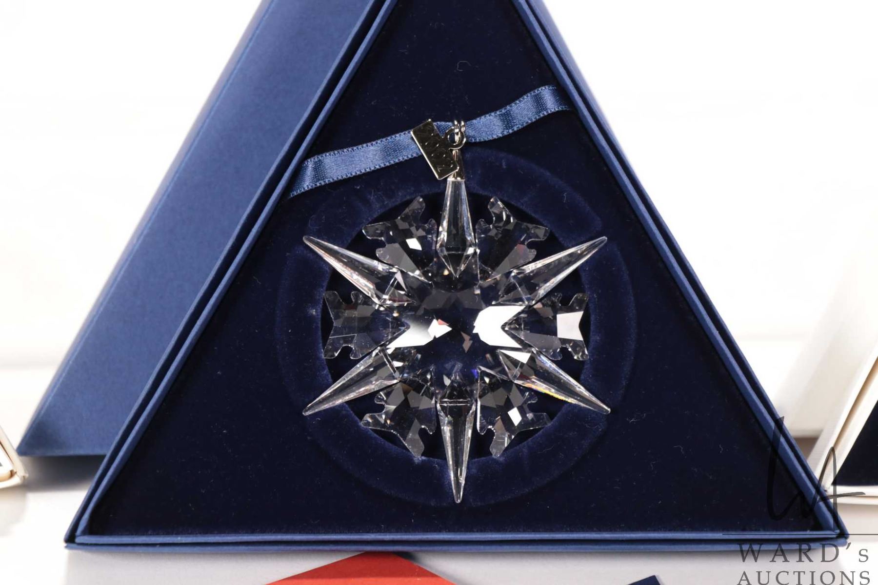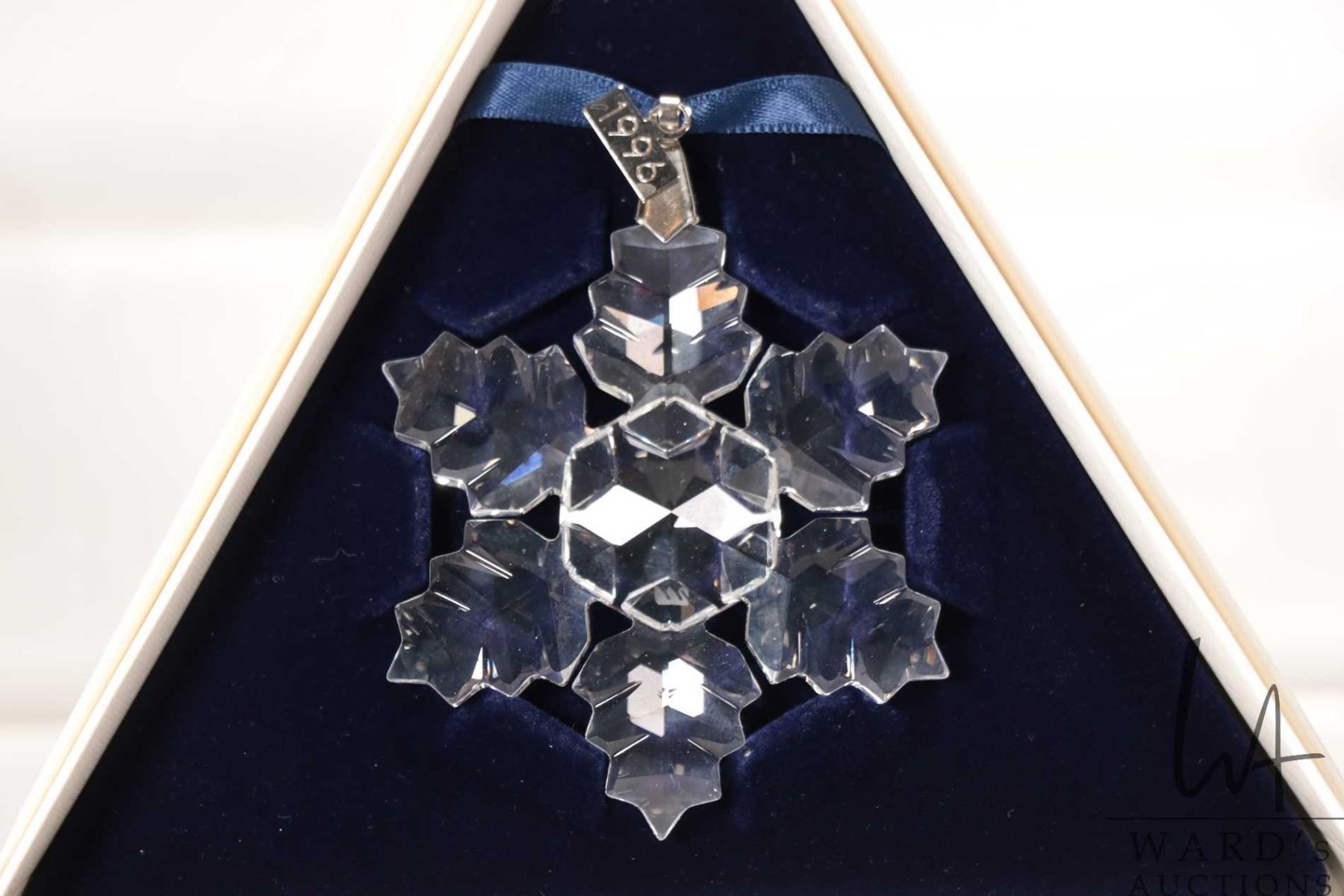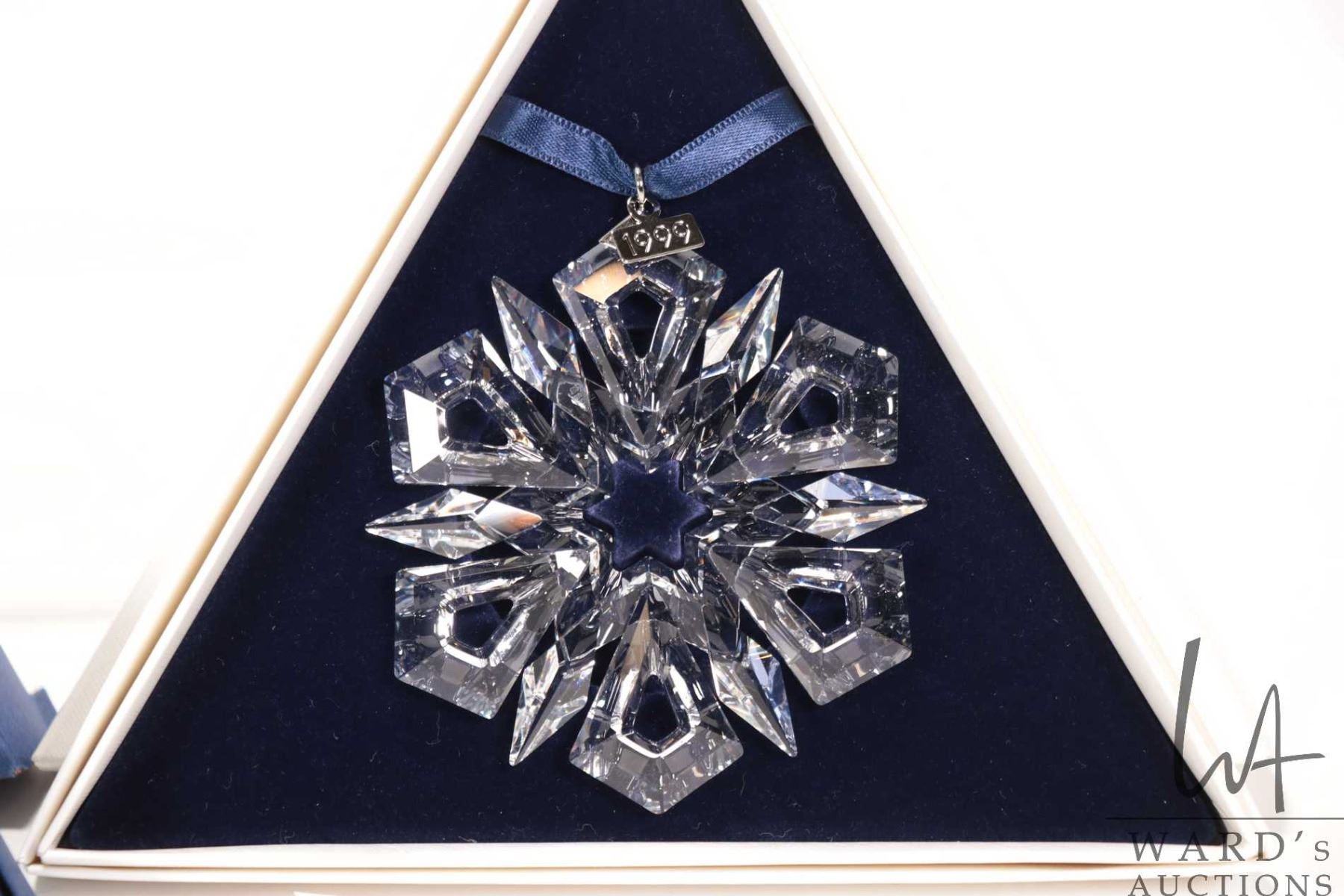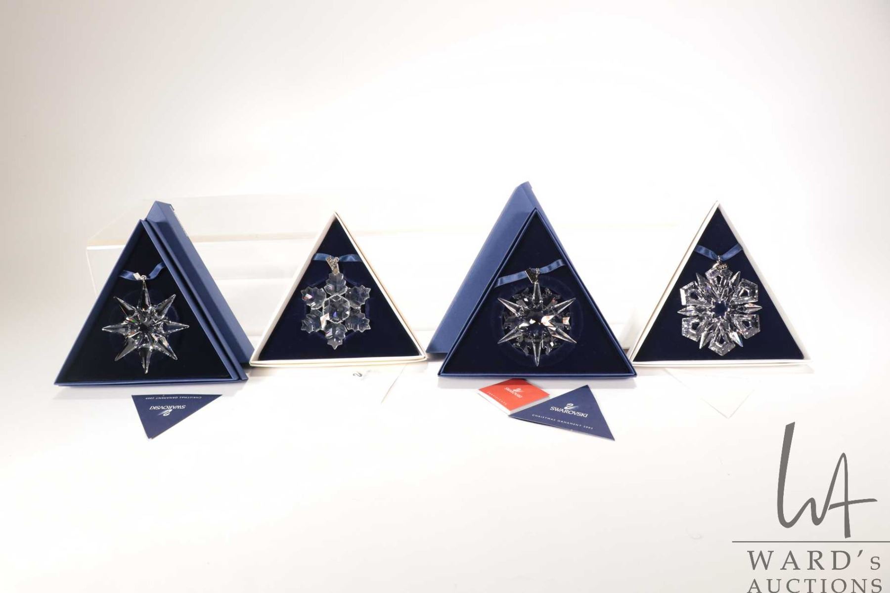 Four Swarovski crystal Christmas ornaments including 1996, 1999, 2002 and 2009