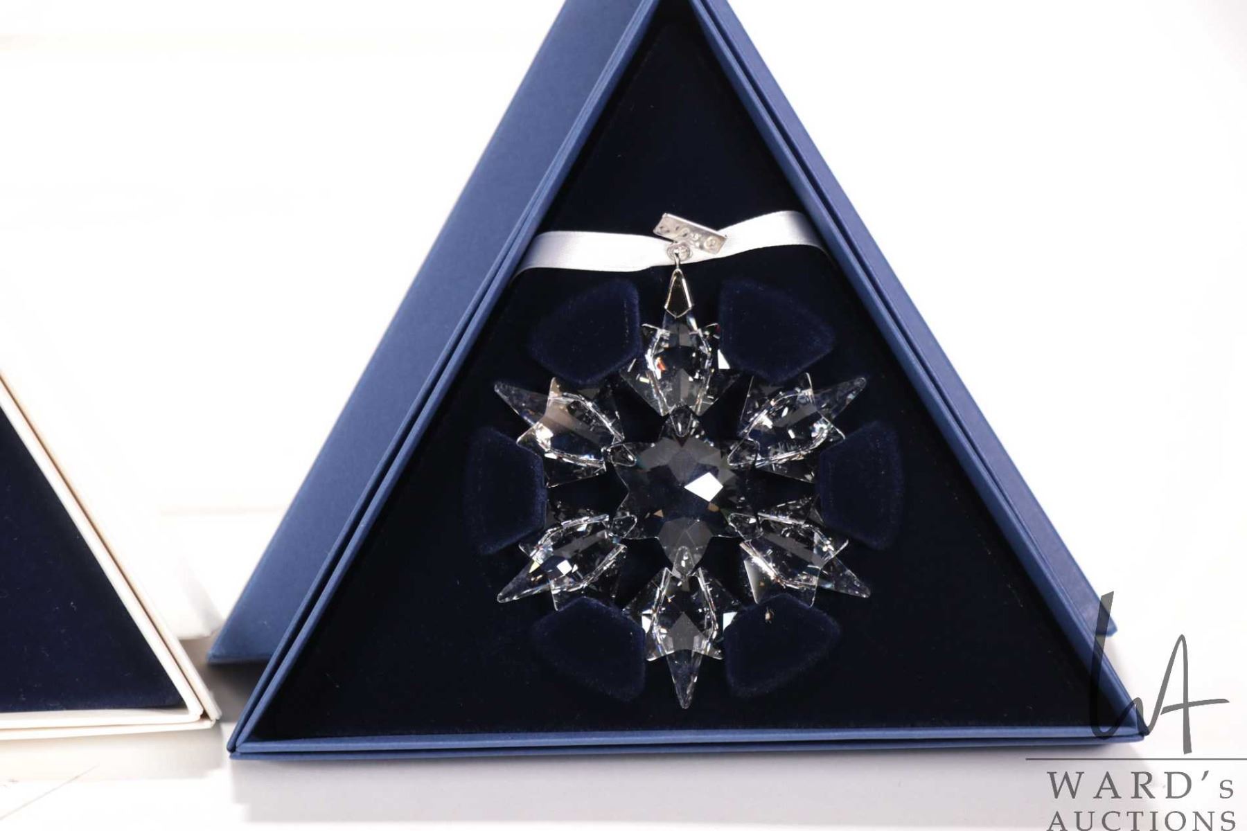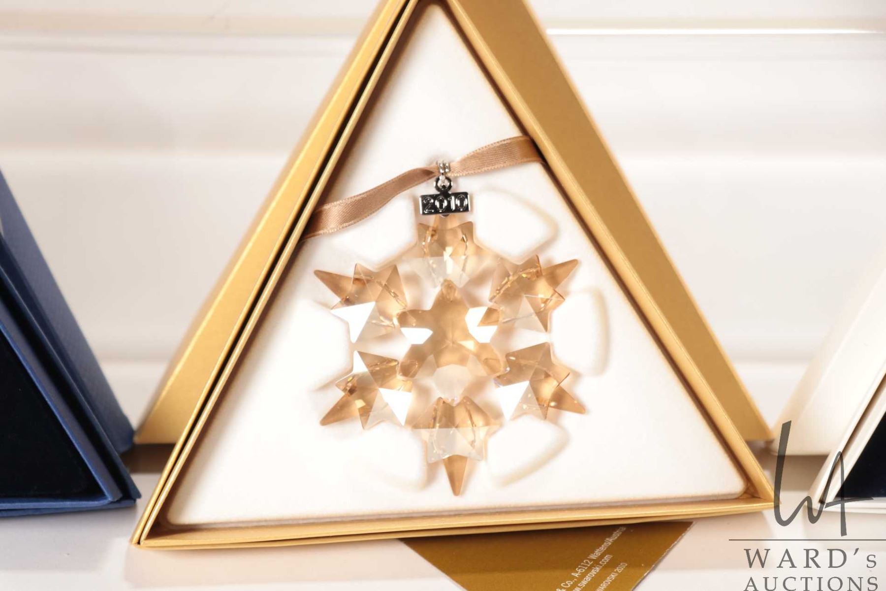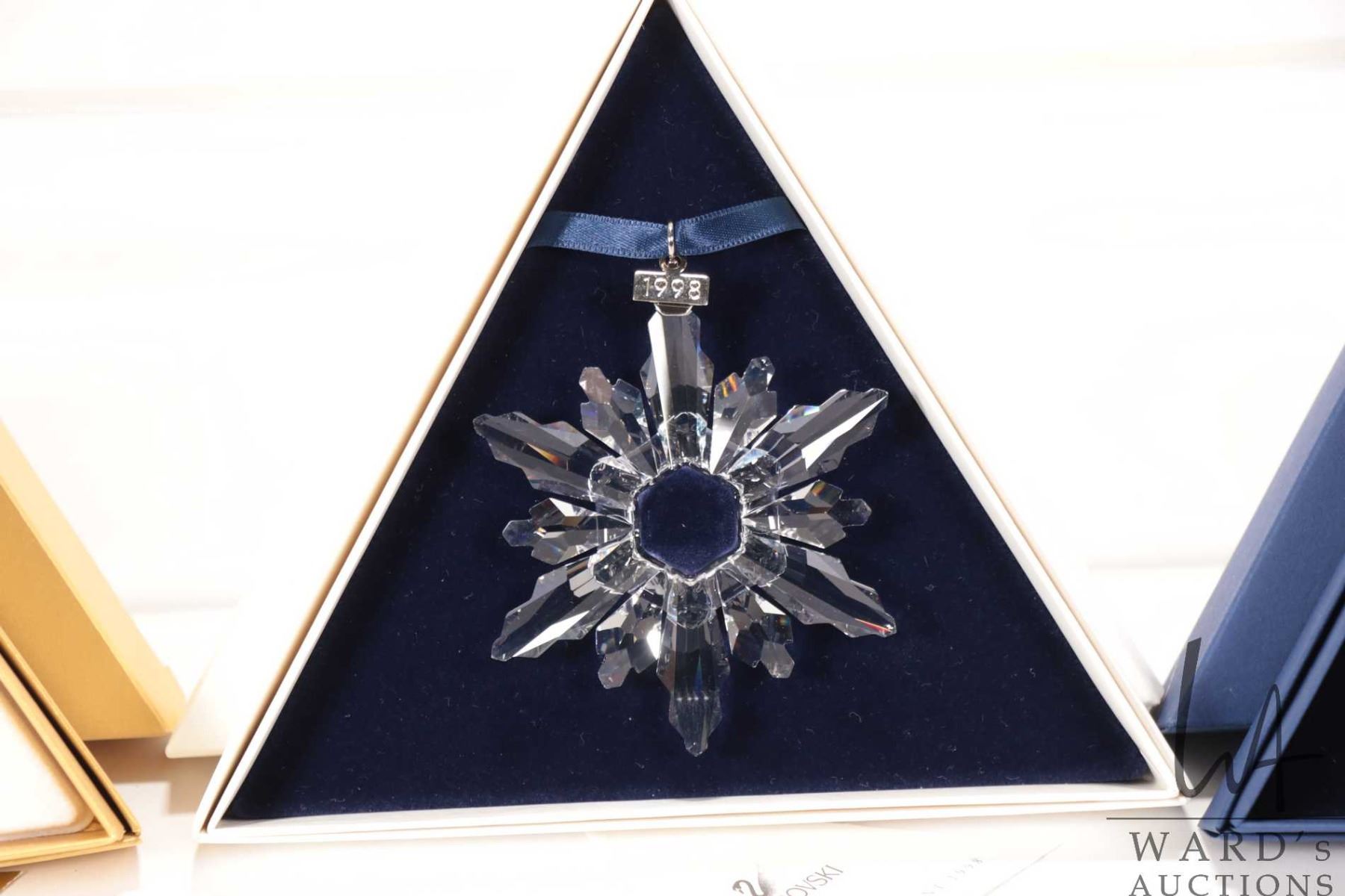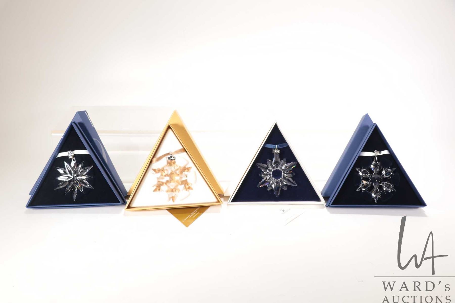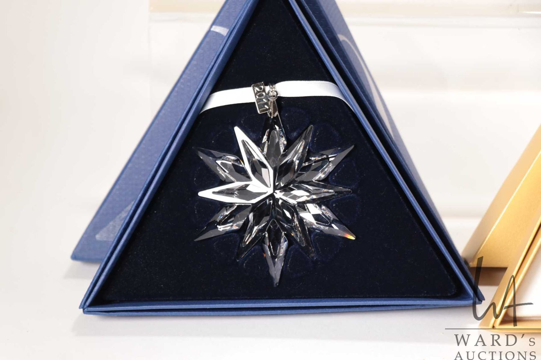 Four Swarovski crystal Christmas ornaments including 1998, 2010 gold and 2010 clear and 2011