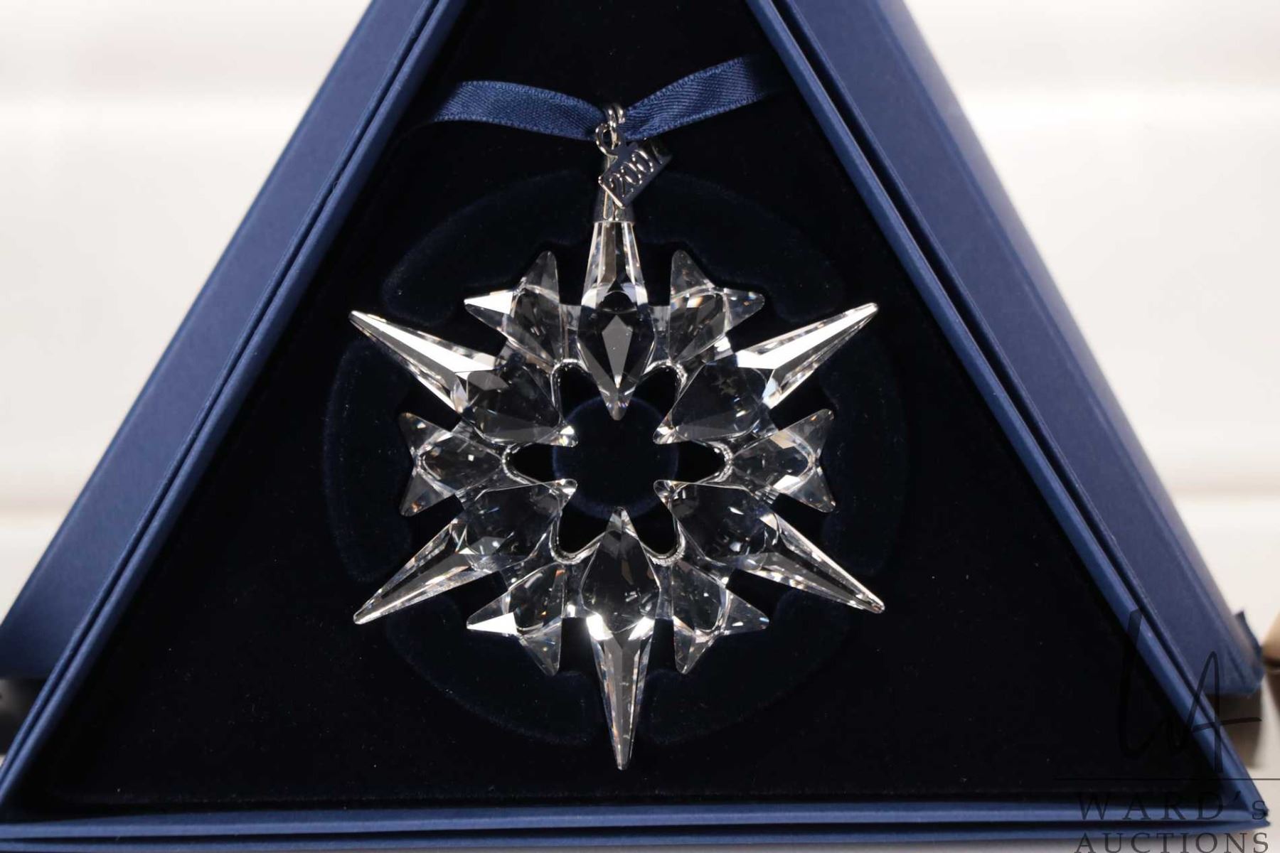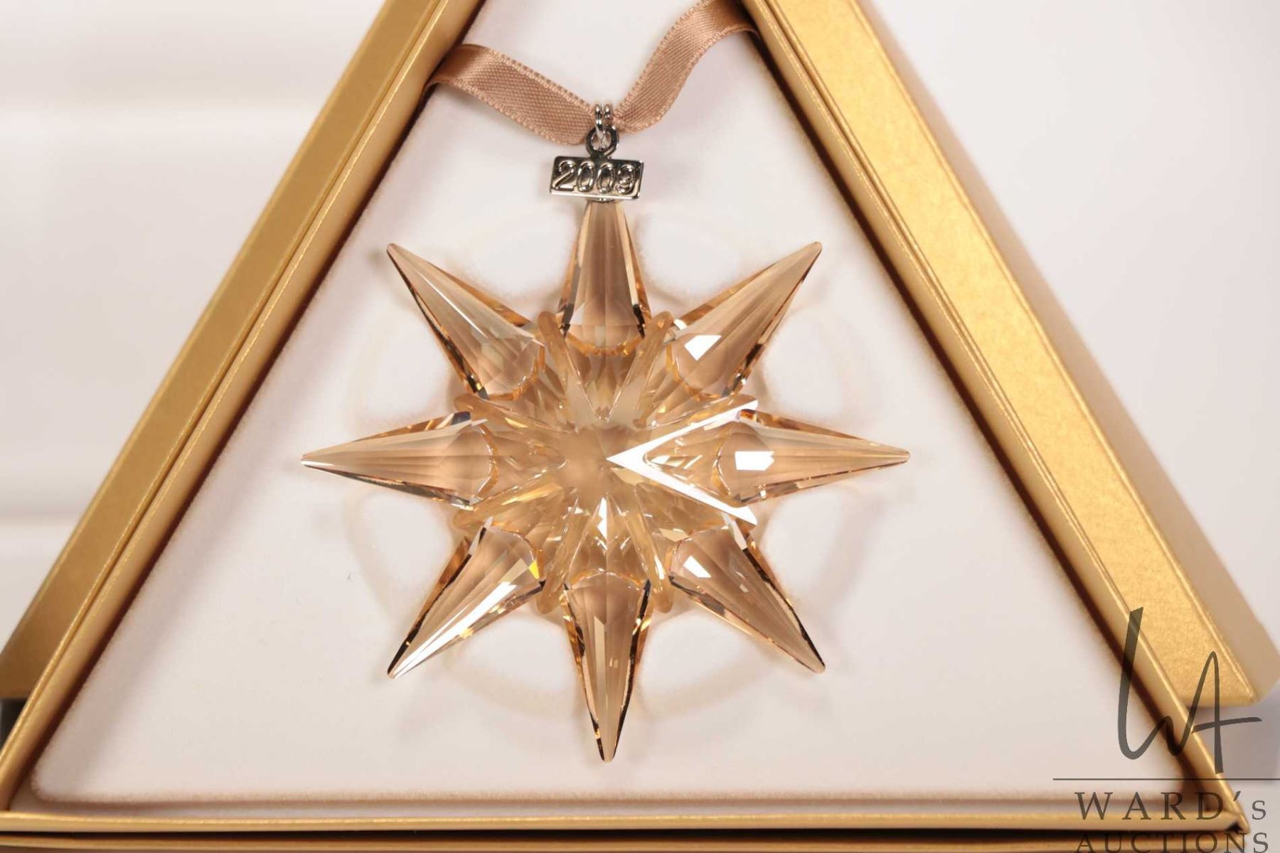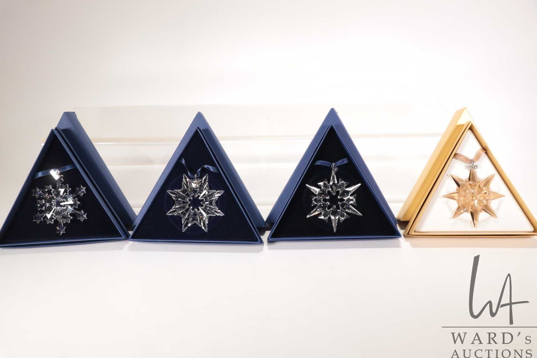 Four Swarovski crystal Christmas ornaments including 2003, 2004, 2007 and gold 2009