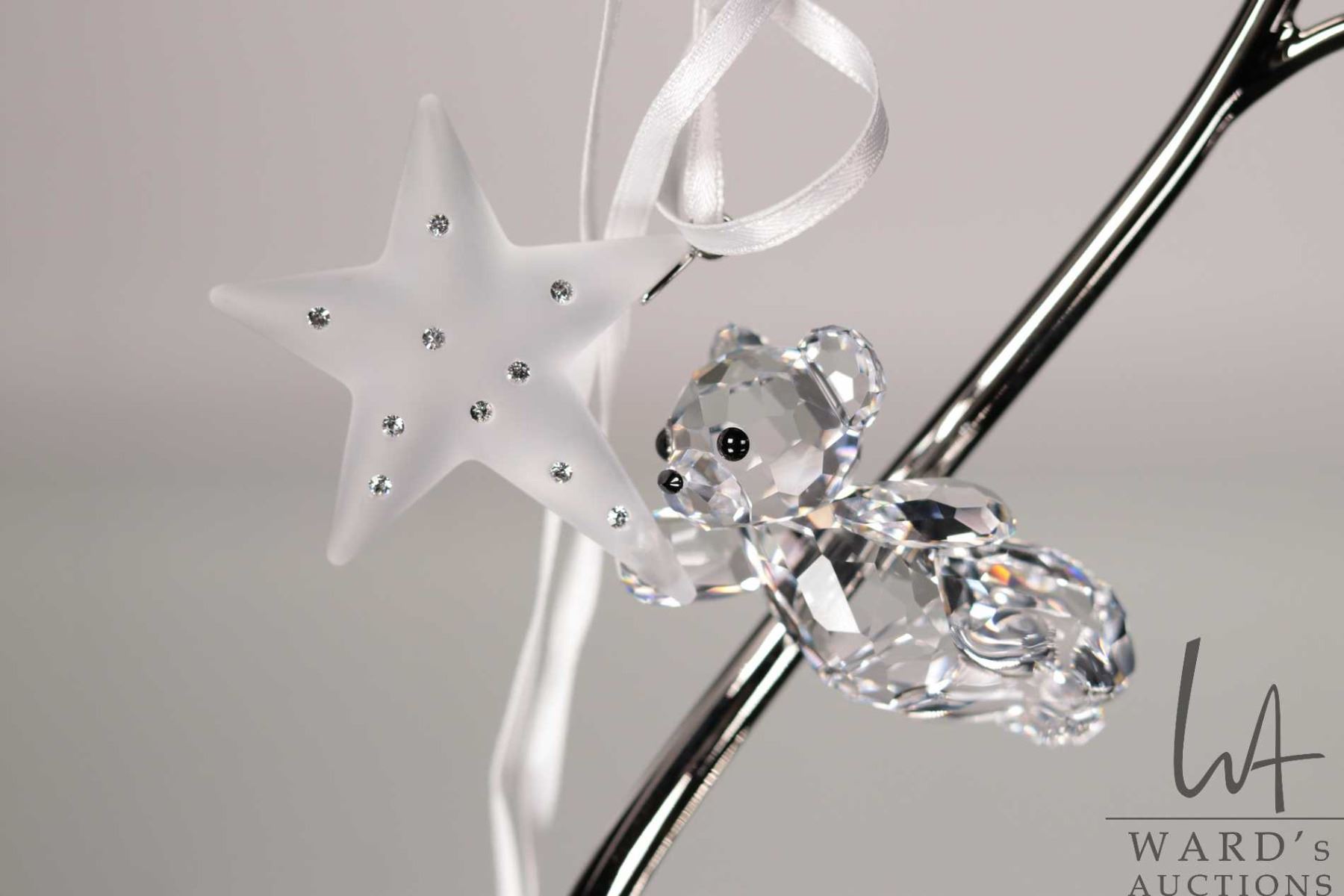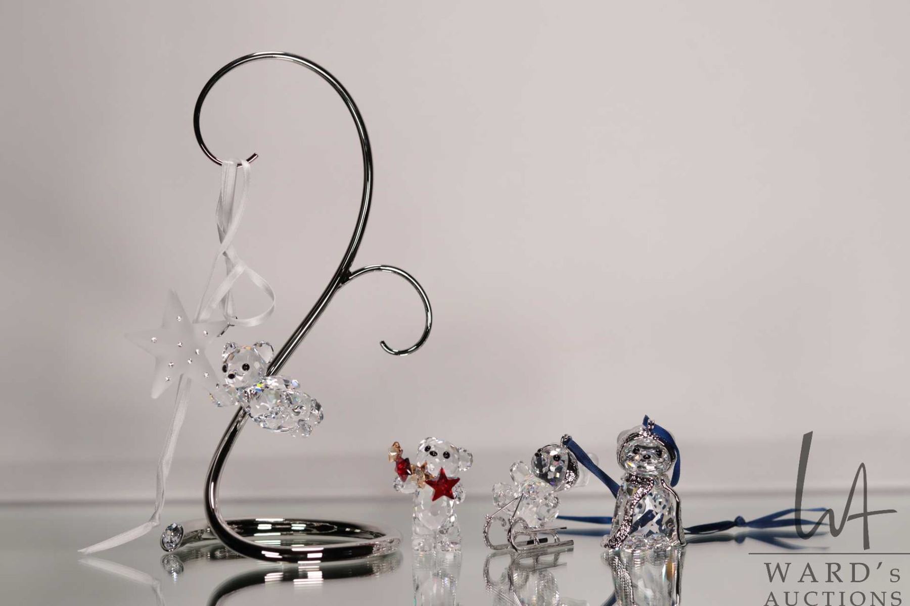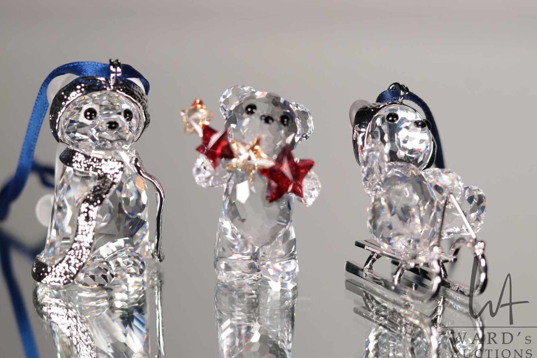 Four Swarovski crystal teddy bear hanging ornaments and an ornament hanger. Incudes original boxes