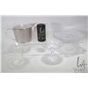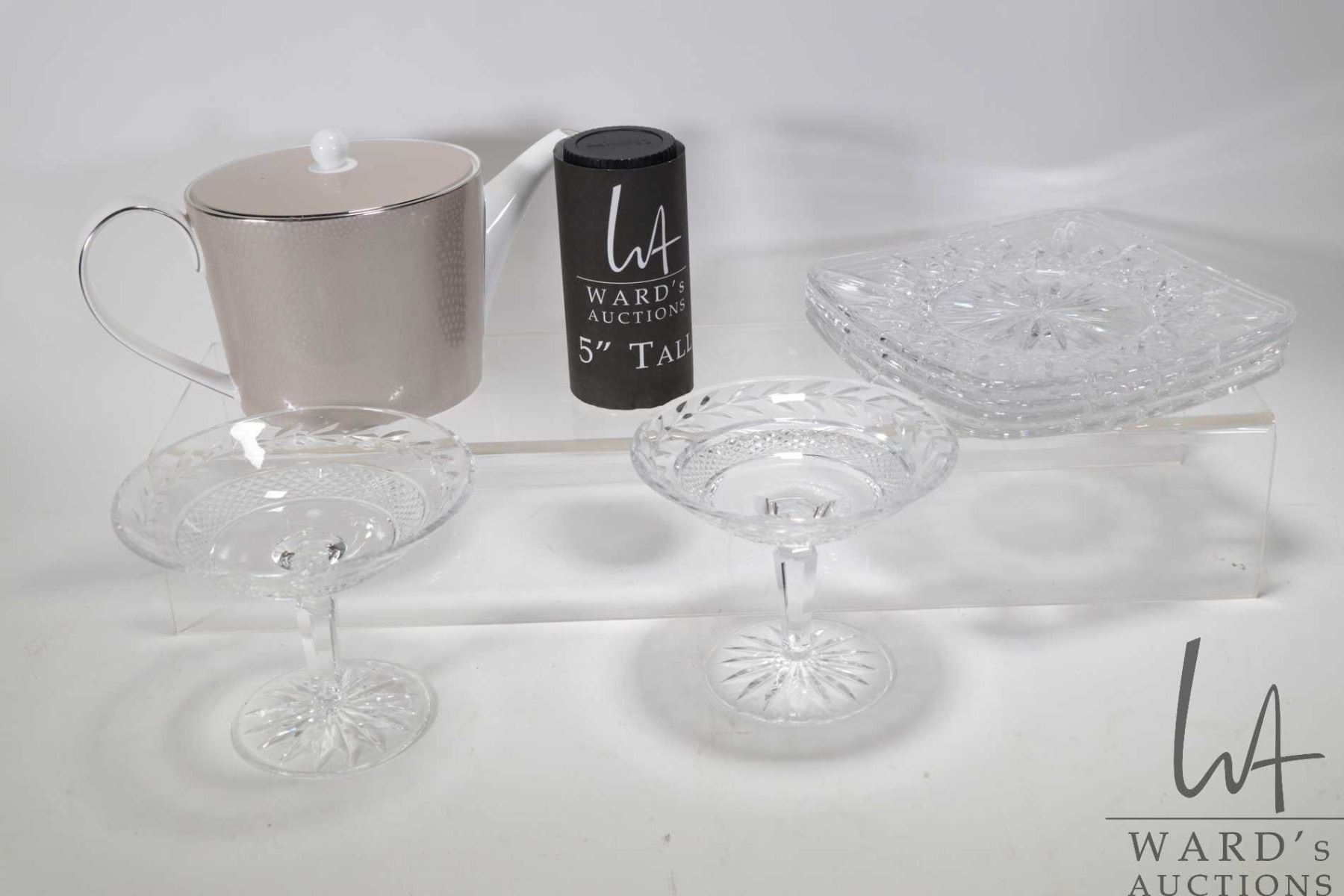 Four Waterford Lismore square 8" plates, two Waterford pedestal comports and a Royal Doulton "Femme Fatale" lidded teapot. Note: Not available for shipping. Local pickup only