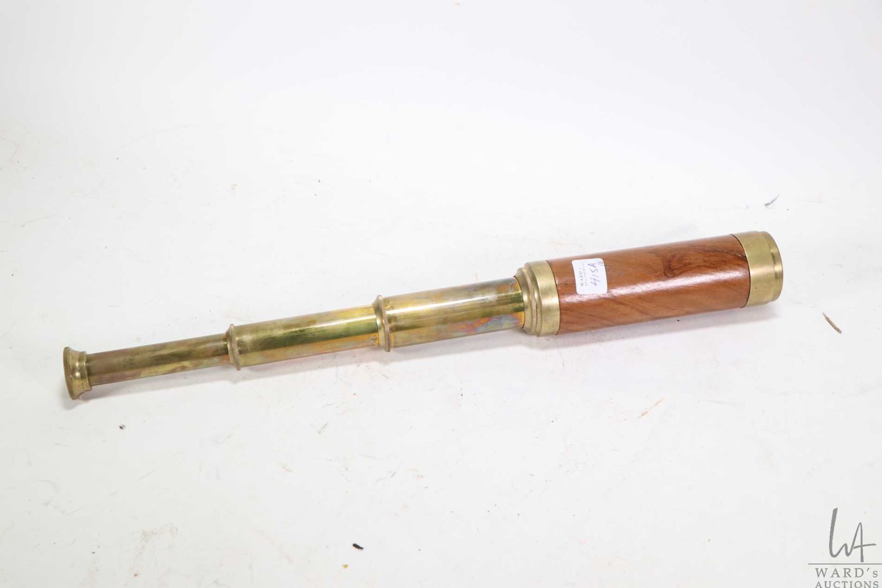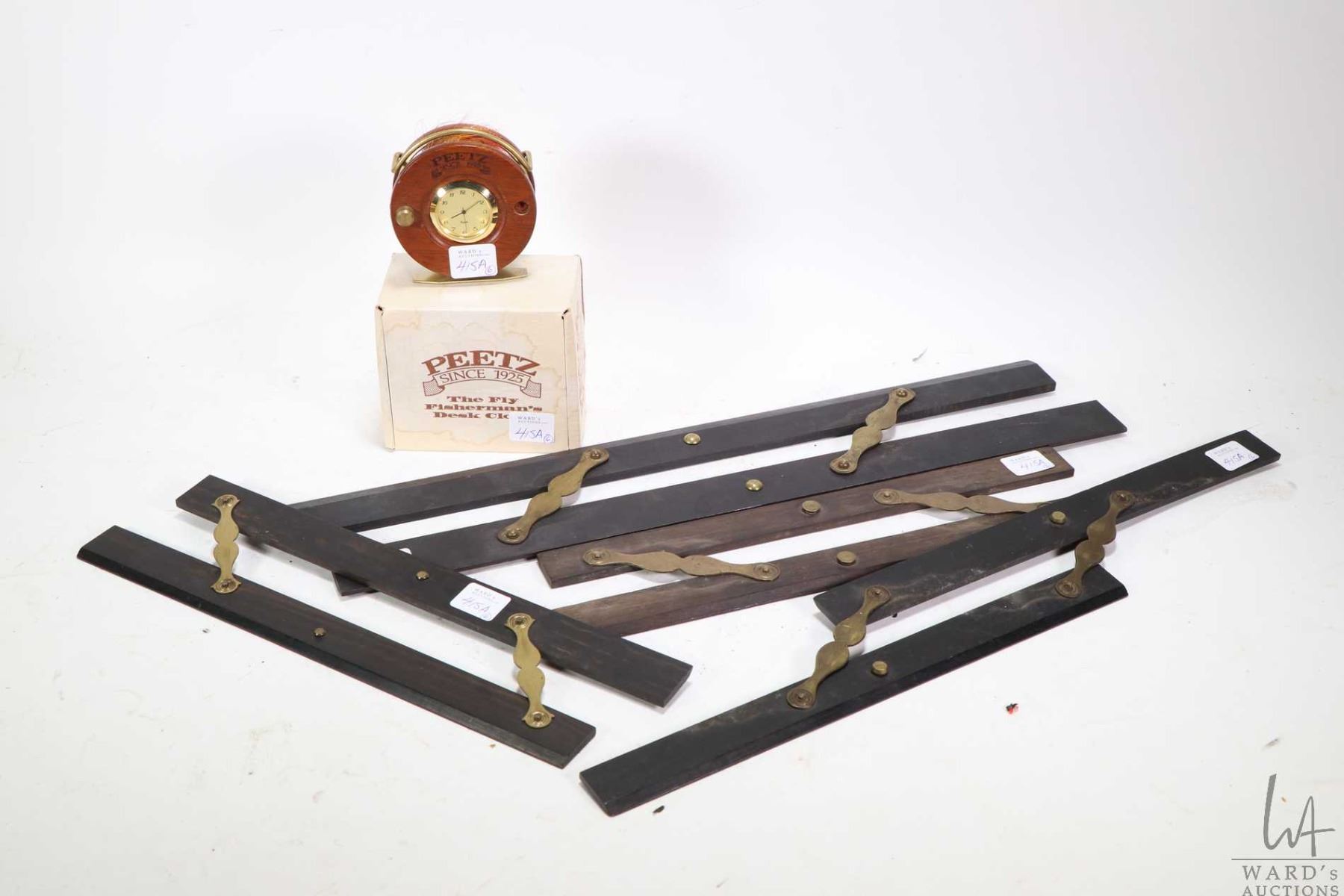 Four antique ebony and brass nautical parallel rules, semi contemporary wood and brass extending telescope and a boxed Peetz fly-fishing reel motif quartz desk clock, not tested