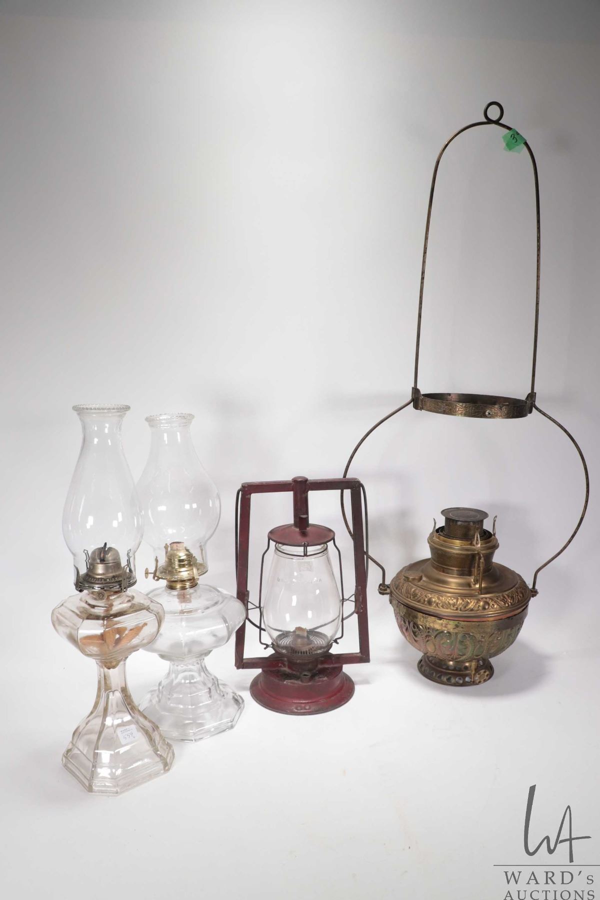 Four antique oil lamps including two colourless glass with chimneys, red barn lamp and bas relief brass hanging brass lamp. NOTE: This Lot Is Not Available For Shipping. Local pickup only.