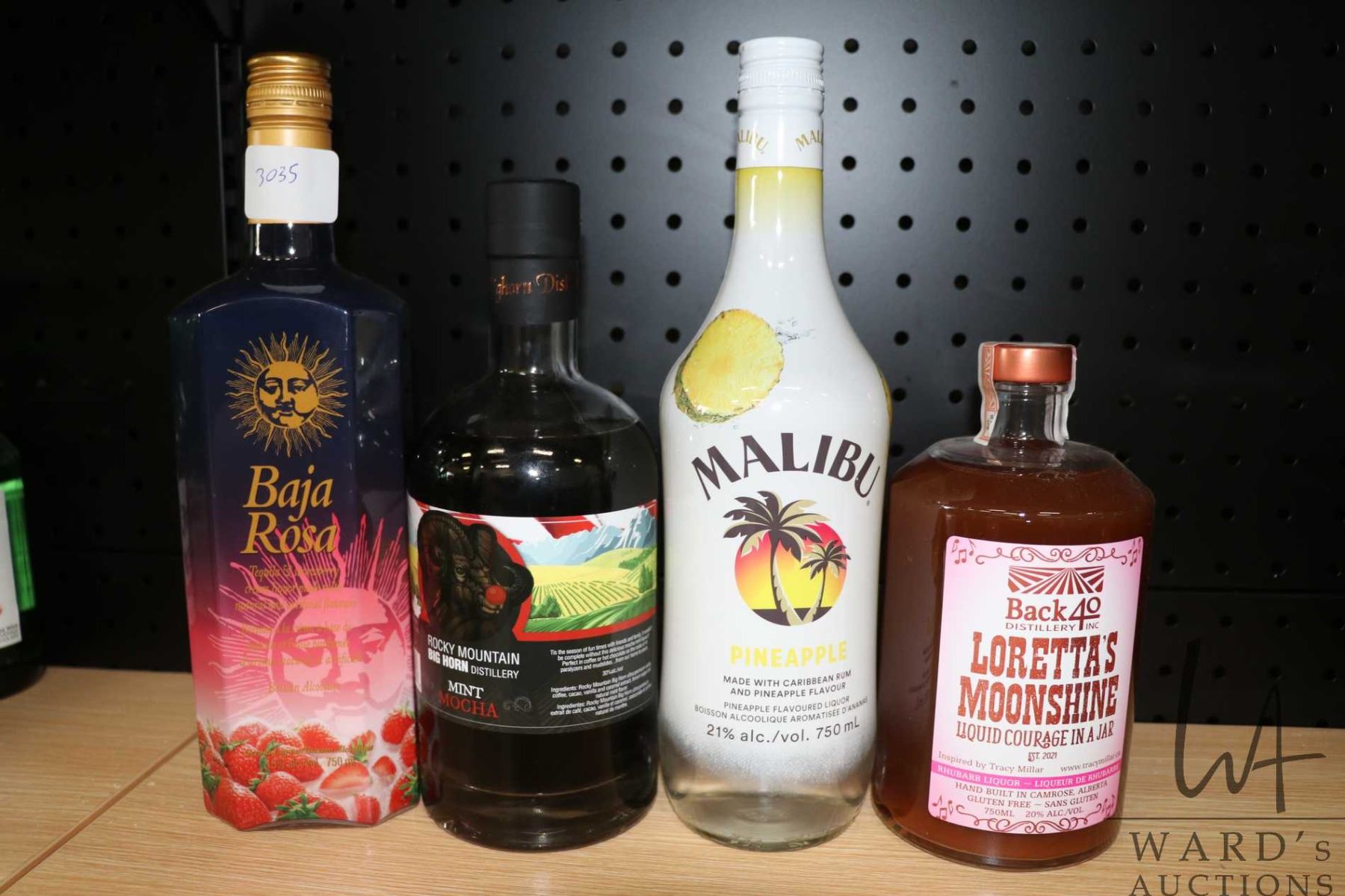 Four assorted bottles of liquor including one Baja Rose Tequila & Strawberry Cream 750ml / 15% ABV, one Rocky Mountain Big Horn Distillery Mint Mocha 30% ABV, one Malibu Pineapple 750ml / 21% ABV and one Back 40 Distillery Inc. Loretta's Moonshine Rhubarb Liquor 750ml / 20% ABV Note: Alcohol cannot be insured by any courier in Canada. Local pick up is recommended. Canadian bidders only