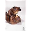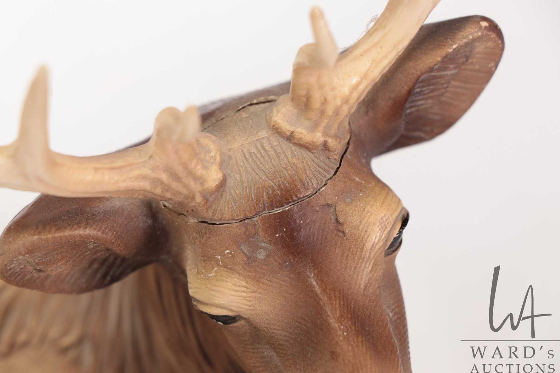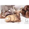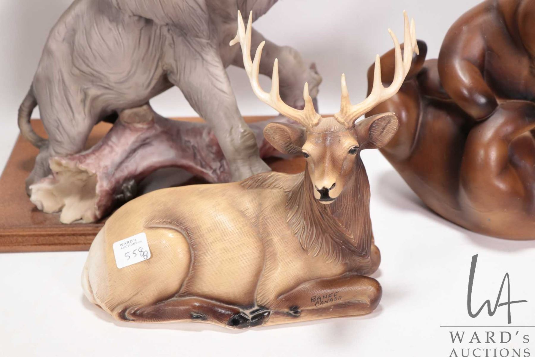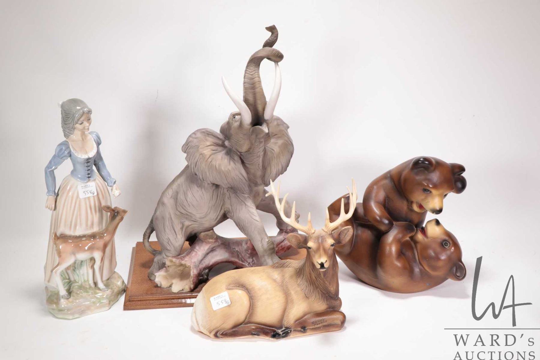 Four assorted collectible figurines including Italian Auro Velcari 16" elephant figure, kitsch antelope from Banff, playful bears piggy bank and Tengra woman with deer figurine
