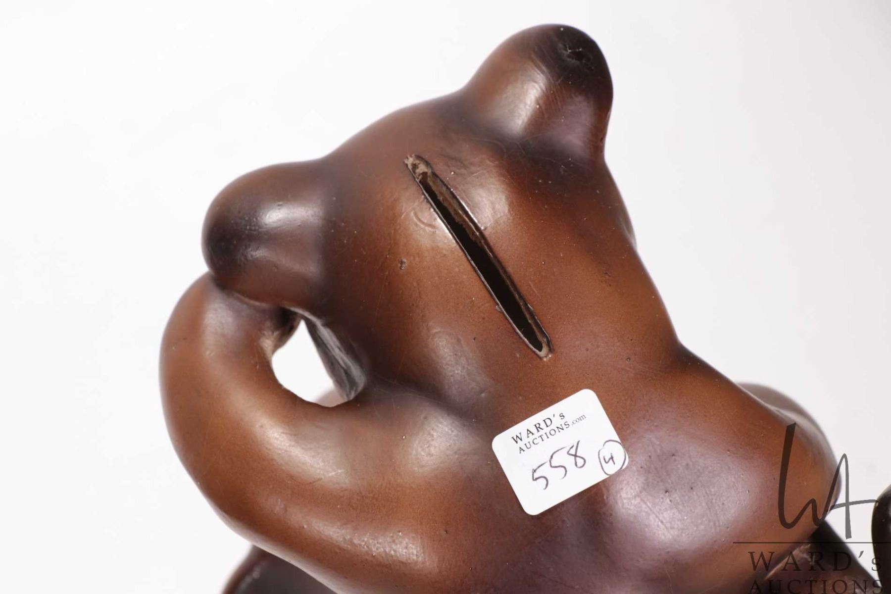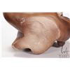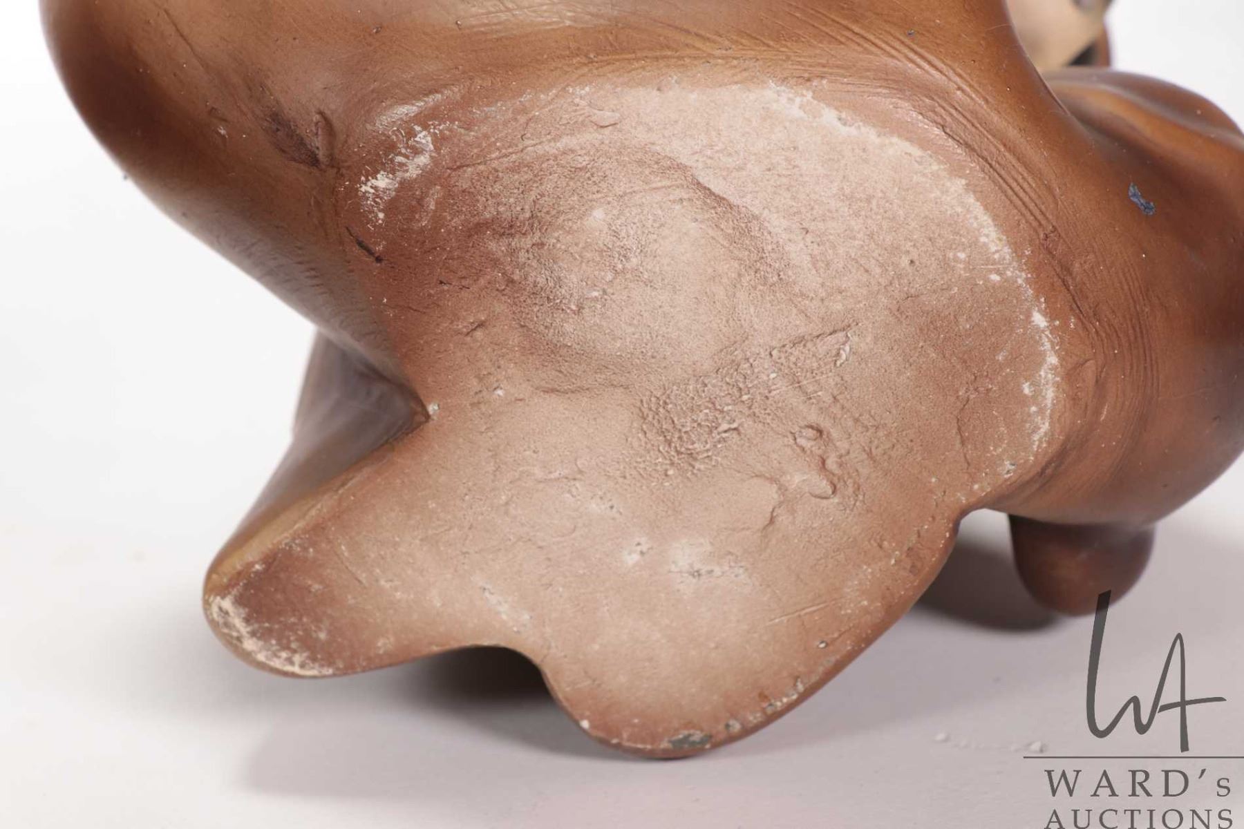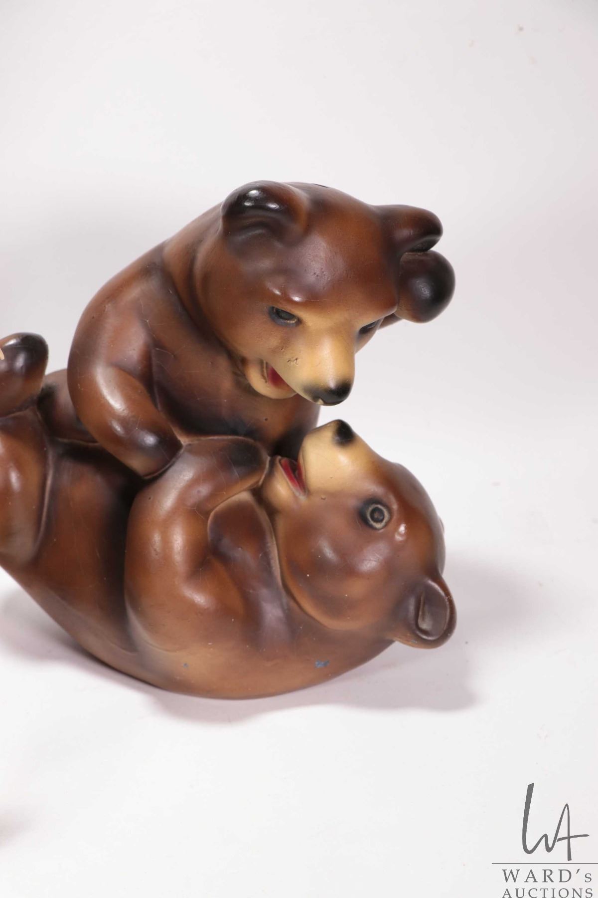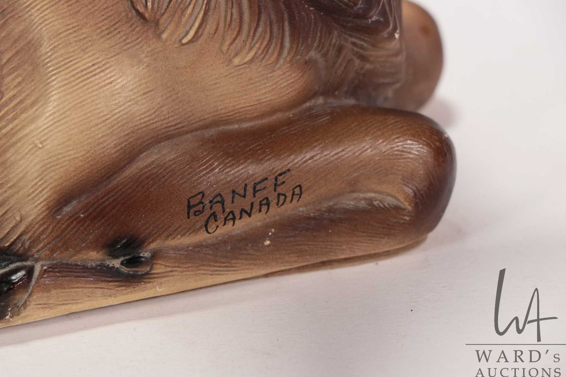 Four assorted collectible figurines including Italian Auro Velcari 16" elephant figure, kitsch antelope from Banff, playful bears piggy bank and Tengra woman with deer figurine