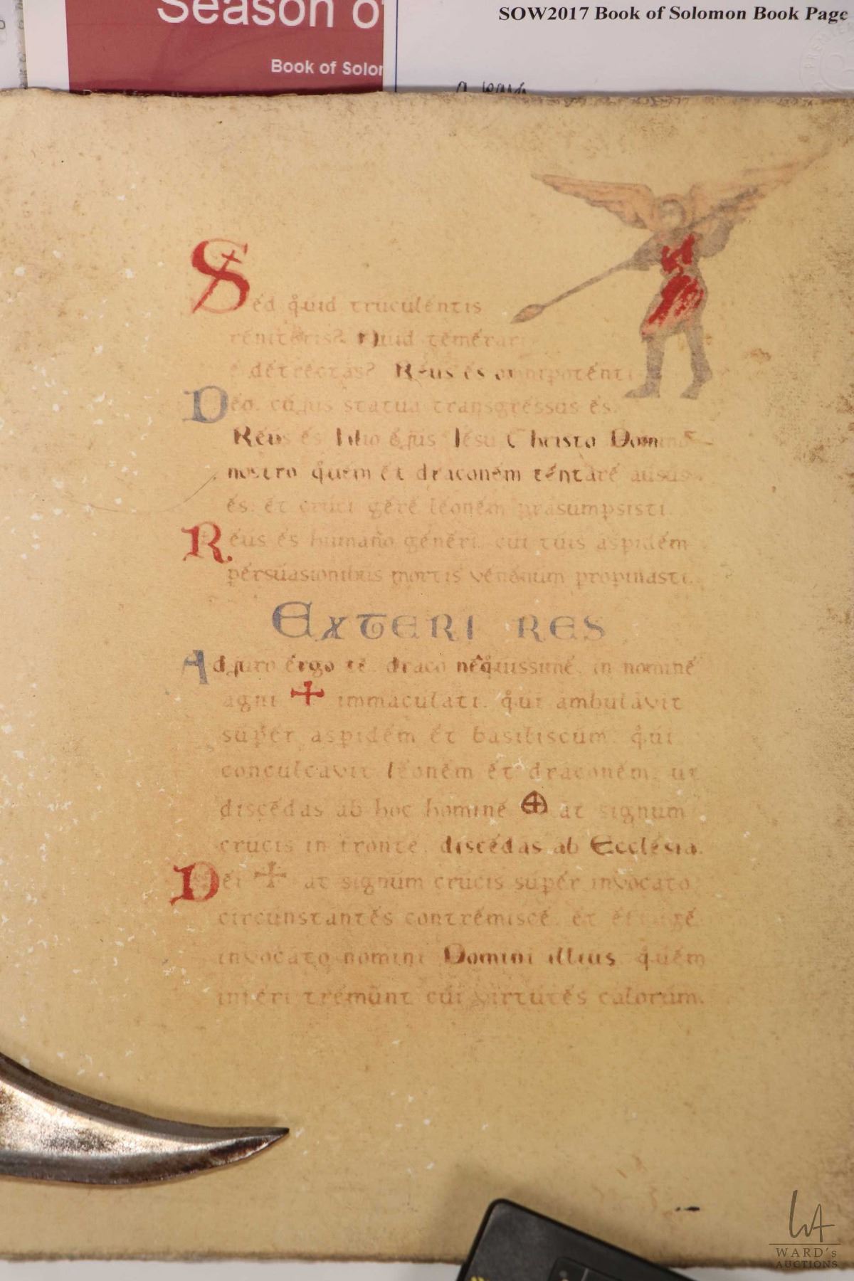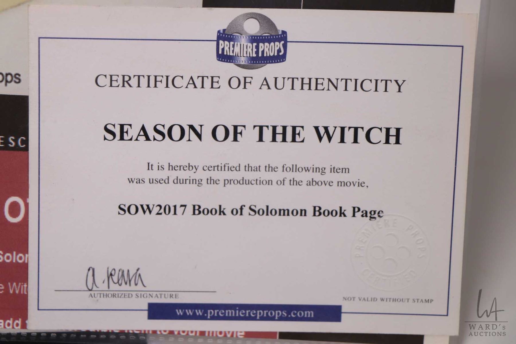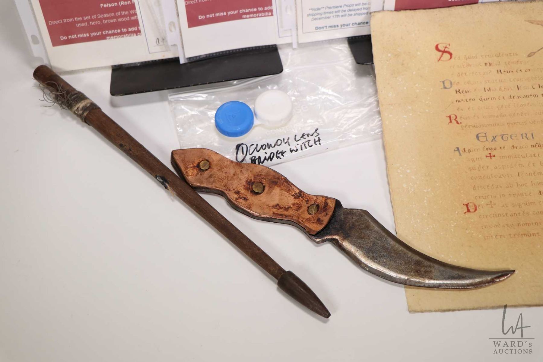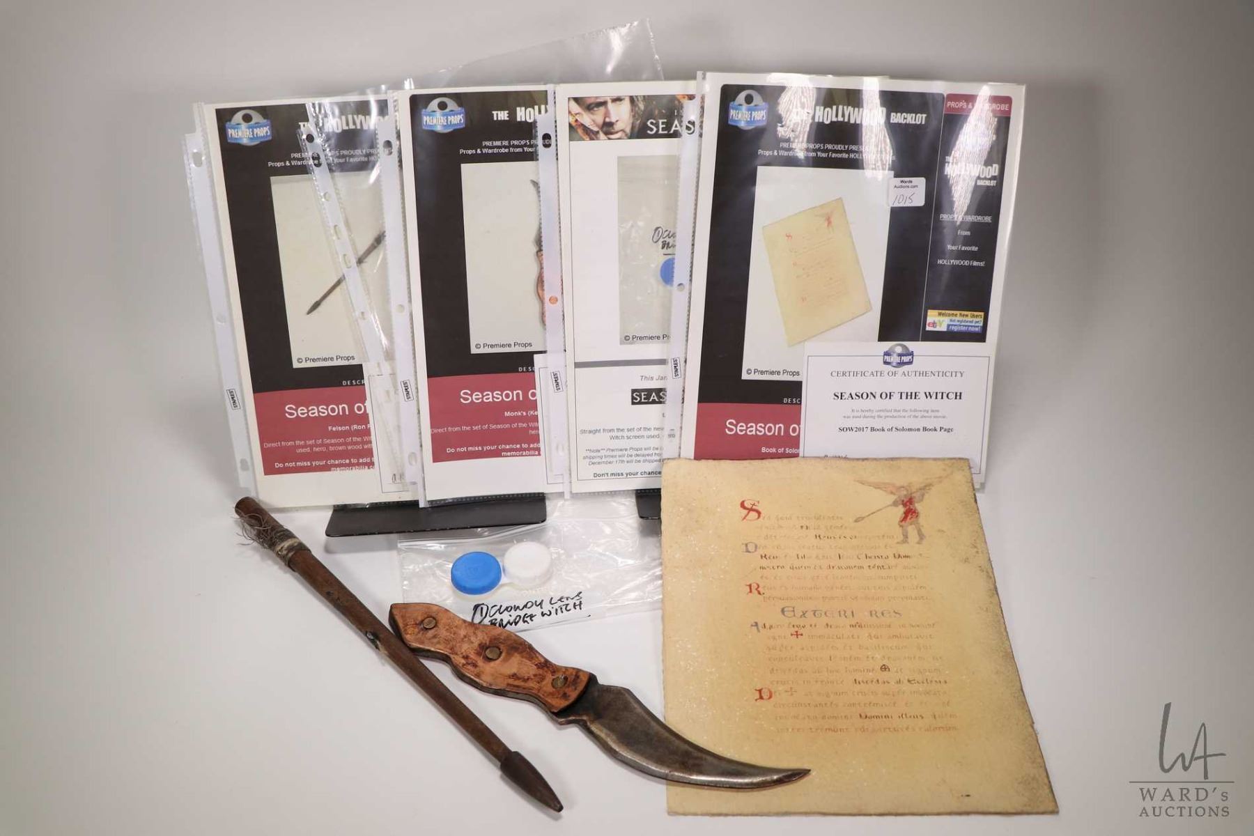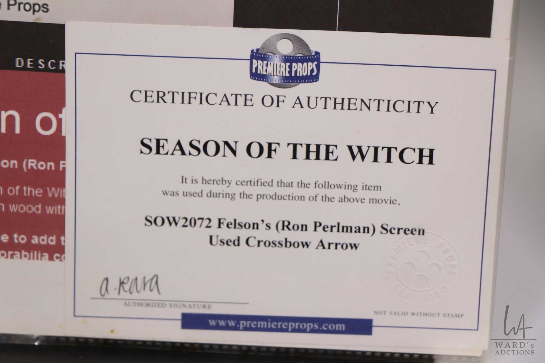 Four authentic movie props from "Season of the Witch" including Felson's ( Ron Perlman) screen used Crossbow arrow, Monk's ( Kevin Rees) screen used knife, Bridge Witch screen used cloudy contact lenses and Book of Solomon book page, all with Premiere Props certificates of authenticity