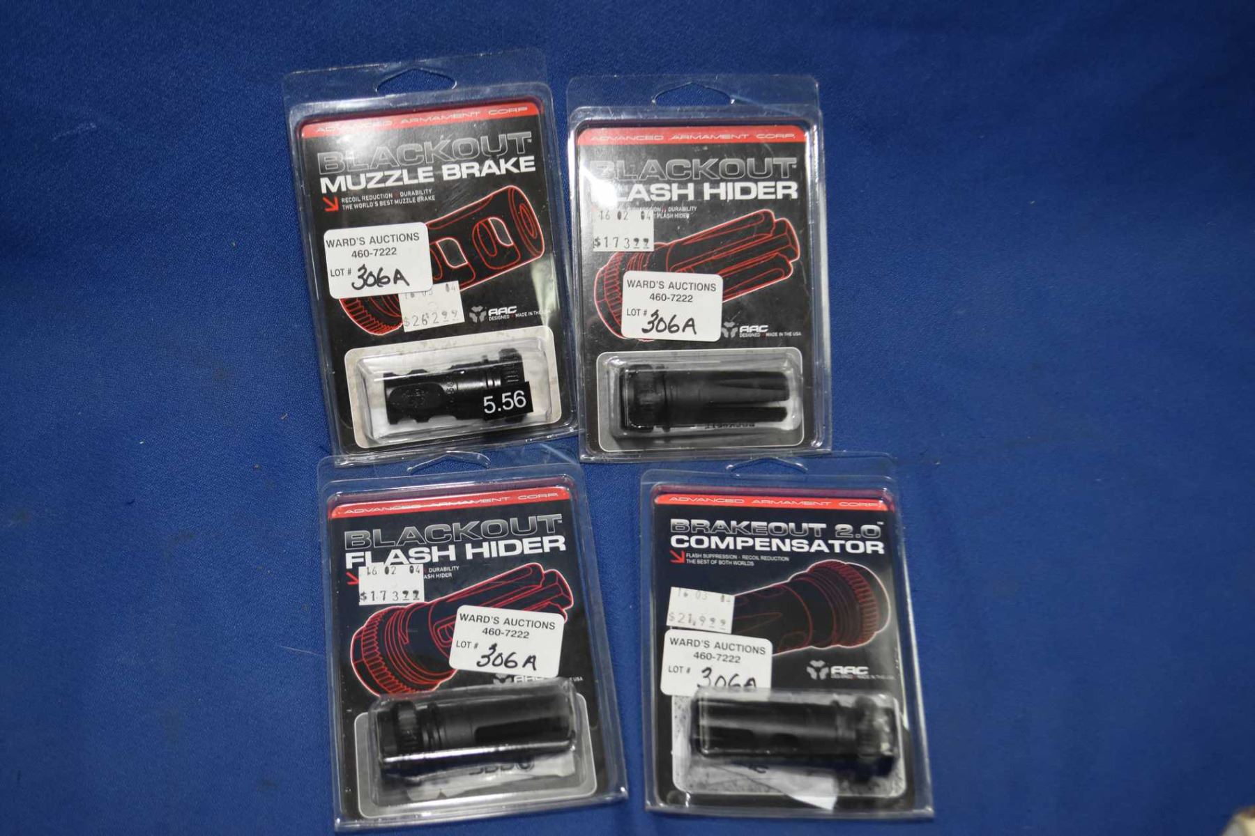 Four barrel attachment Four new in package Advance Armament Corp. threaded barrel attachments including two flash hiders, muzzle brake and compensator, all 51 tooth 1/2" X 28 thread pitch and three are 7.62/6.5/6.8 except the compensator is 5.56