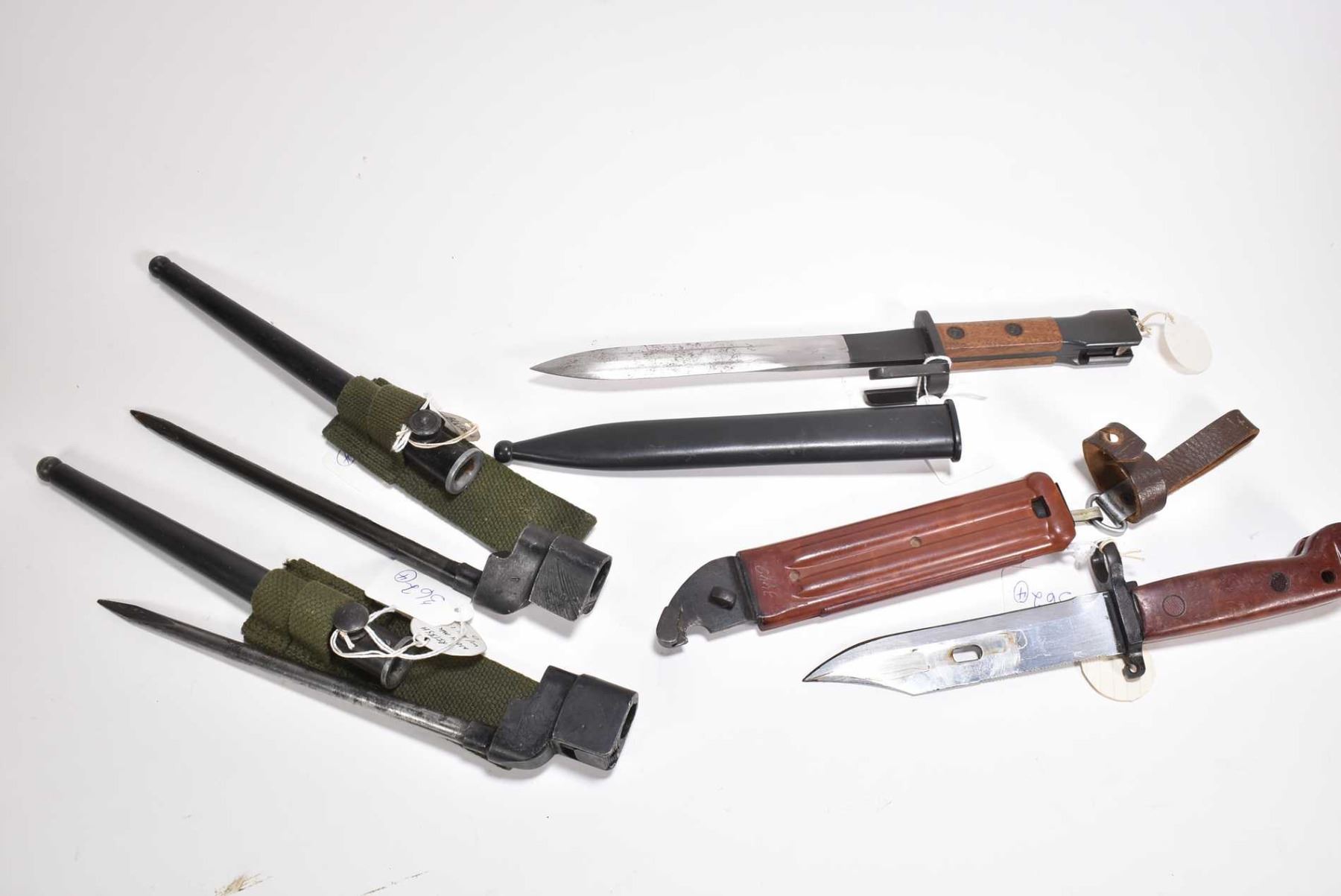 Four bayonets including as marked by consignor a Belgium FN FAL type A, USSR AKM type I transitional and two Enfield spike bayonets