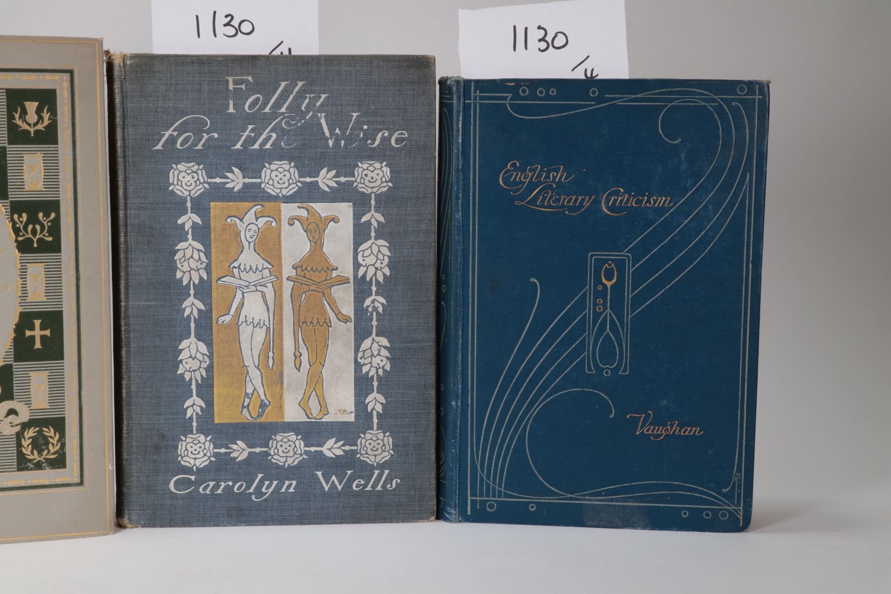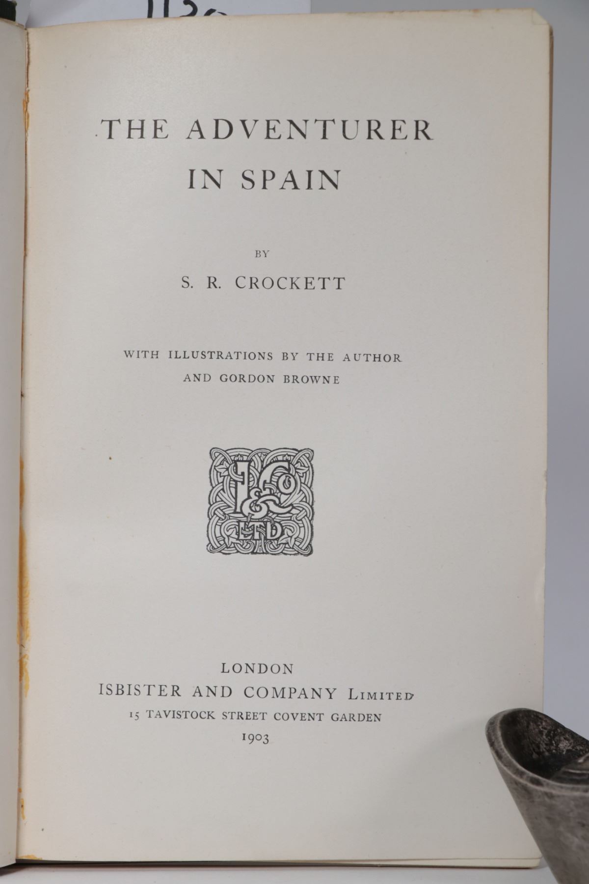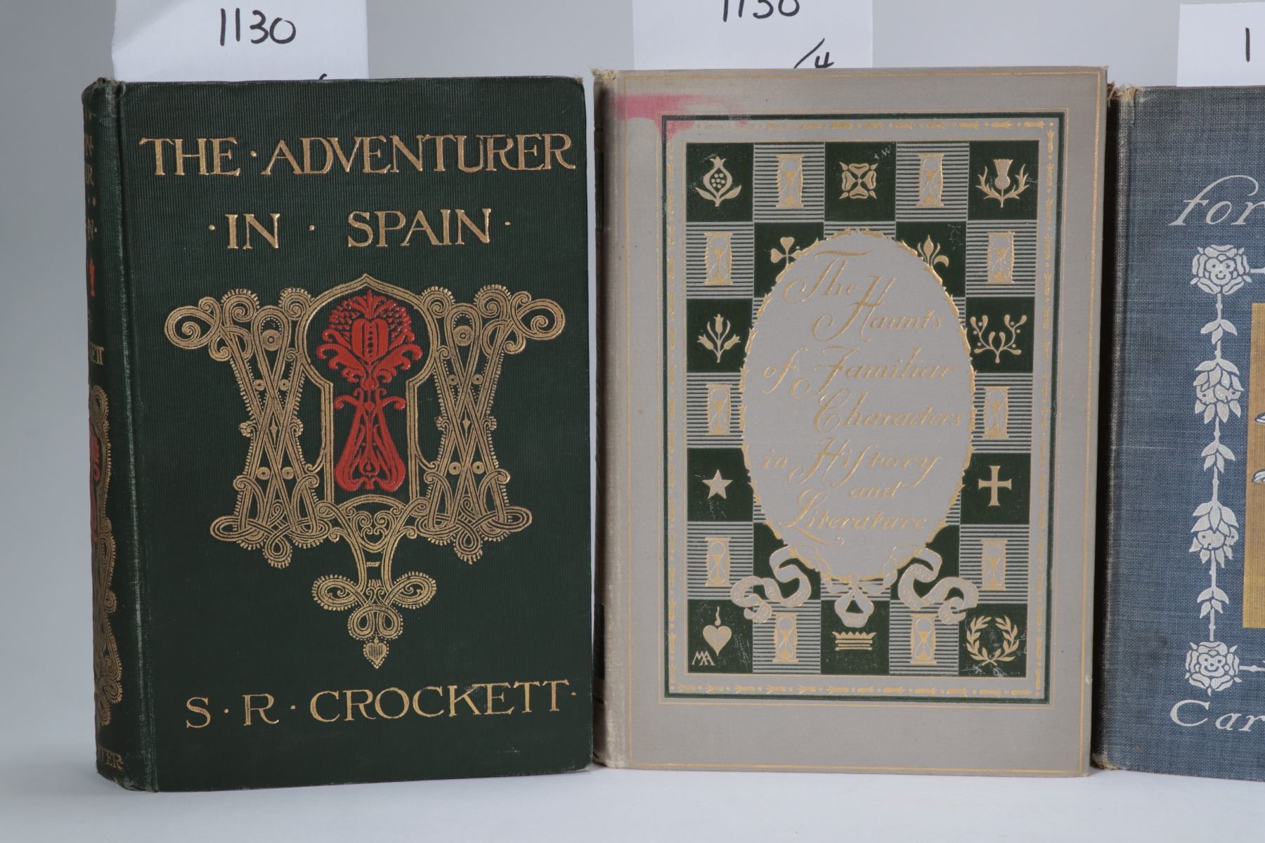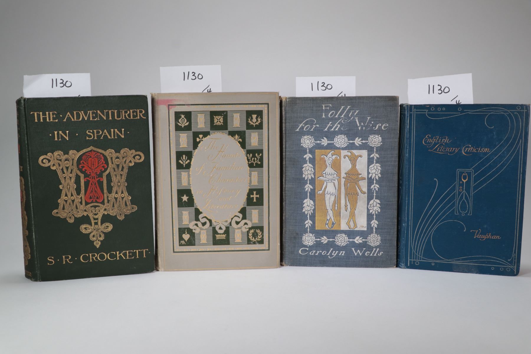 Four books including "The Adventurer in Spain" by S.R. Crockett. Illustrated by the author and Gordon Browne. Published by Isbister and Company Limited, London 1903. Hardboard decorative covers with embossing in gold and red. "Where Ghosts Walk-The Haunts of Familiar Characters in History and Literature" by Marion Harland. Illustrated. Published by G.P. Putnam's Sons, New York and London 1899, Decorative hardboard cover with gold embossing. "Folly for the Wise" by Carolyn Wells. Illustrated. Published by The Bobbs-Merrill Company 1904. Decorative hardboard covers. "English Literary Criticism" C.E. Vaughan. Published Blackie & Sons, London 1896. Decorative hardboard covers with gold embossed lettering