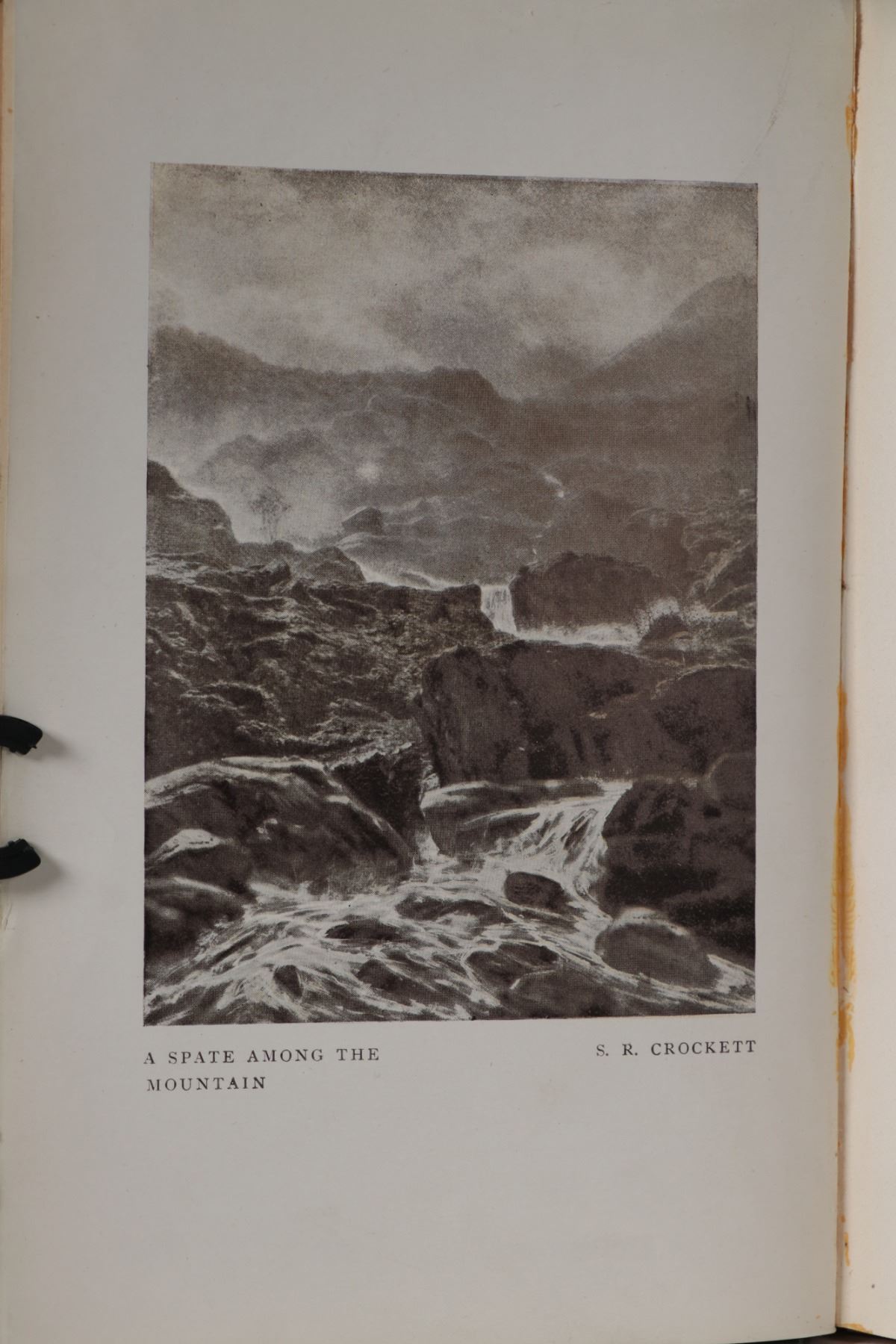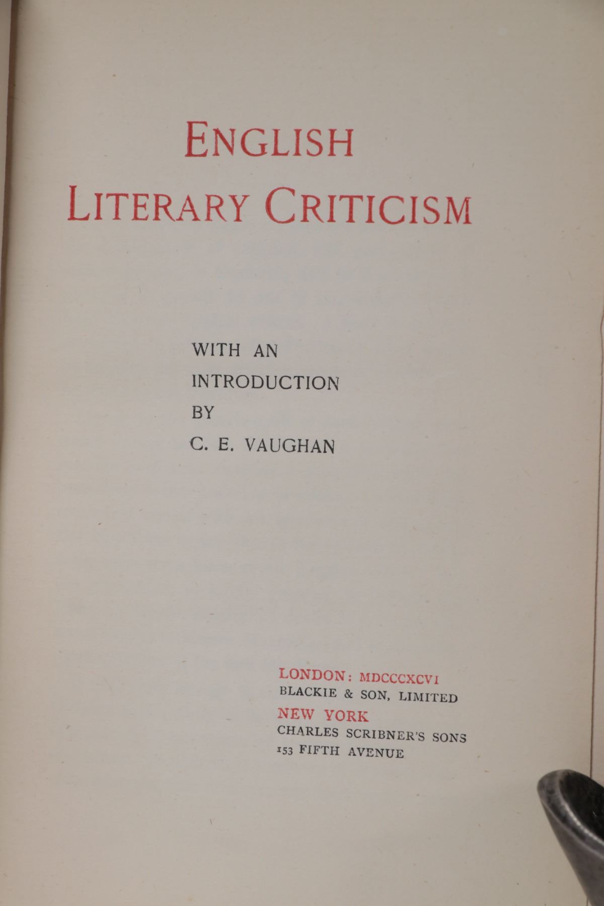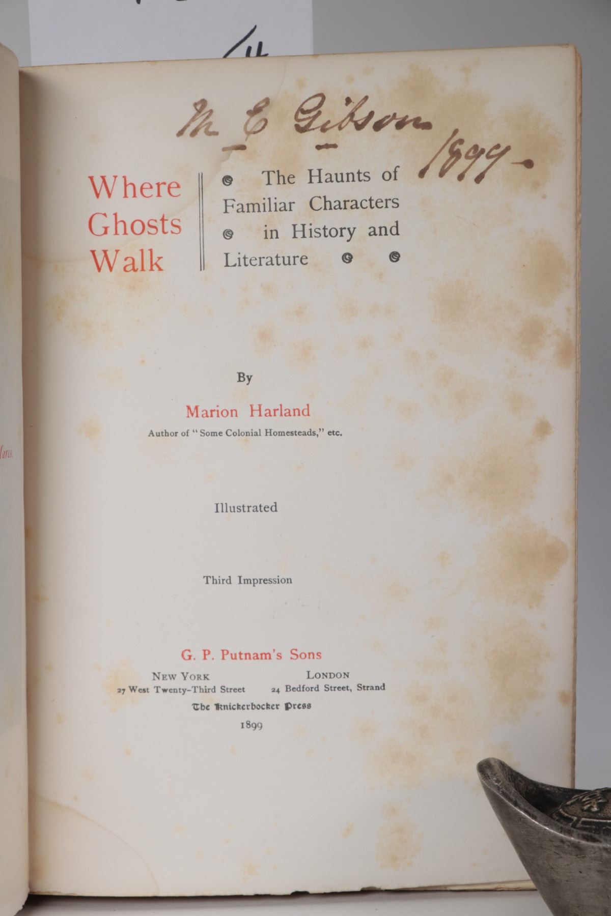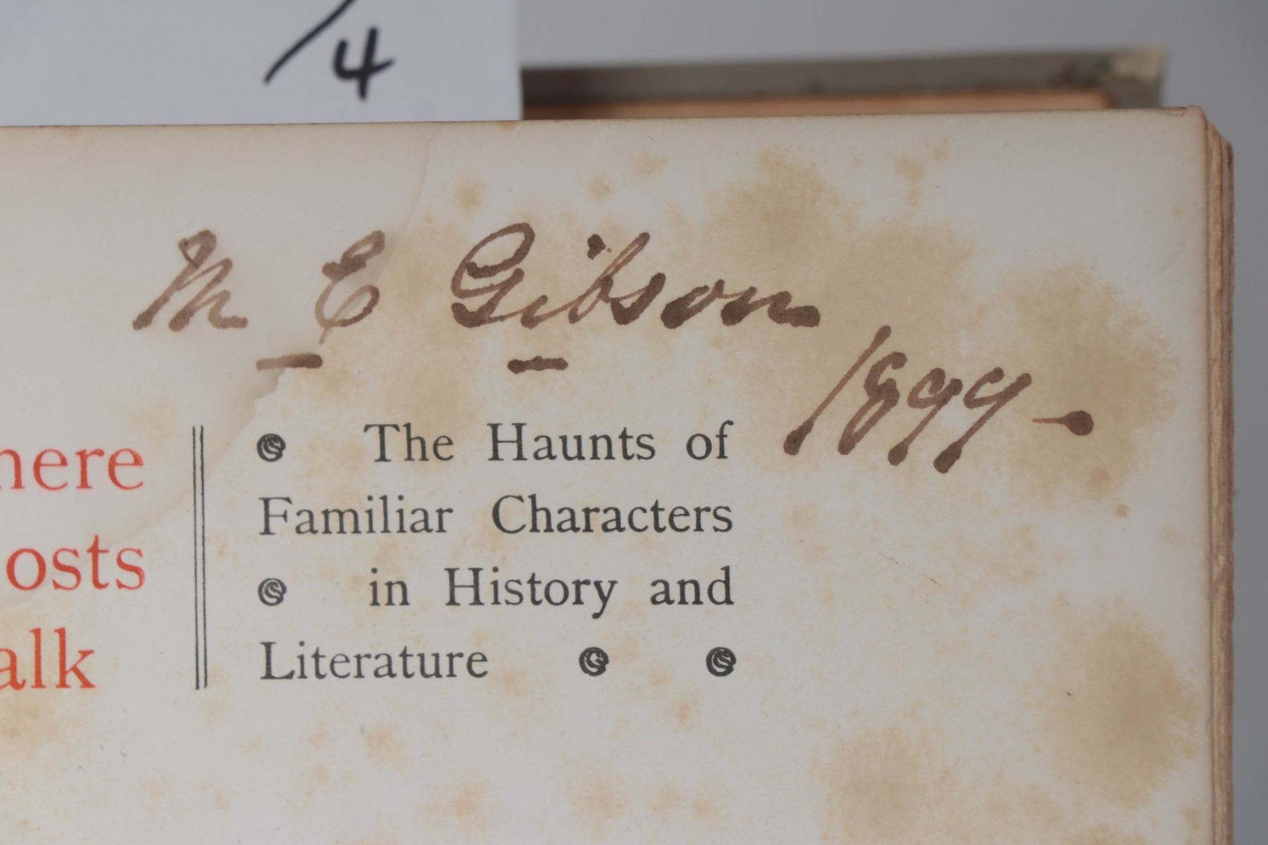 Four books including "The Adventurer in Spain" by S.R. Crockett. Illustrated by the author and Gordon Browne. Published by Isbister and Company Limited, London 1903. Hardboard decorative covers with embossing in gold and red. "Where Ghosts Walk-The Haunts of Familiar Characters in History and Literature" by Marion Harland. Illustrated. Published by G.P. Putnam's Sons, New York and London 1899, Decorative hardboard cover with gold embossing. "Folly for the Wise" by Carolyn Wells. Illustrated. Published by The Bobbs-Merrill Company 1904. Decorative hardboard covers. "English Literary Criticism" C.E. Vaughan. Published Blackie & Sons, London 1896. Decorative hardboard covers with gold embossed lettering