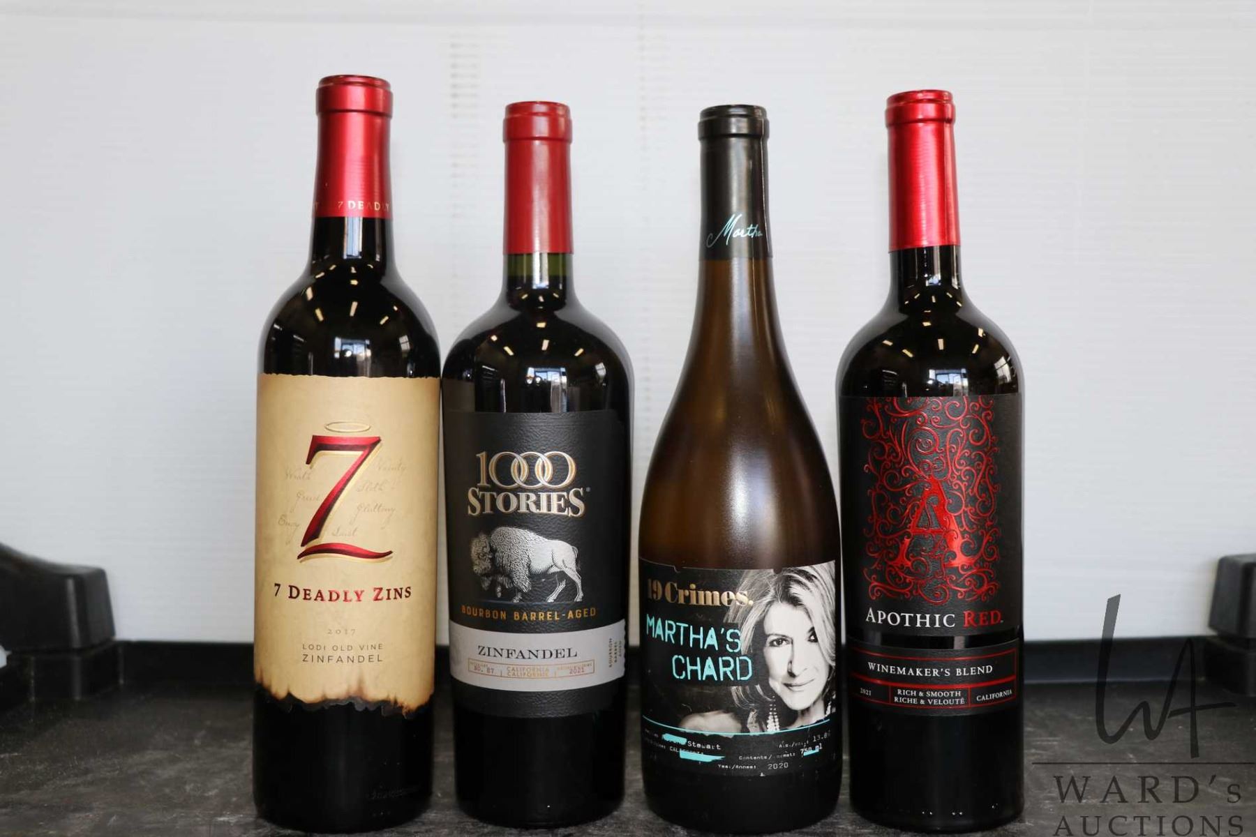 Four bottles of wine including 7 Deadly Zins Zinfandel 2017 750ml / 15% ABV, 1000 Stories Zinfandel 2021 750ml / 15.2% ABV, 19 Crimes. Martha's Chard 2020 750ml / 13.8% ABV, and a Apothic Red Winemakers Blend 2021 750ml / 13.5% ABV Note: Alcohol cannot be insured by any courier in Canada. Local pick up is recommended. Canadian bidders only