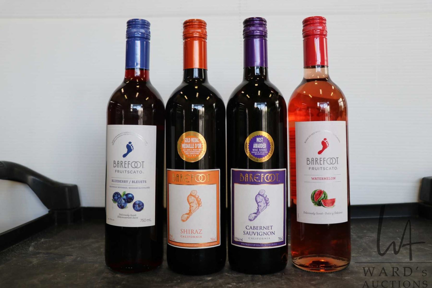 Four bottles of wine including Barefoot Fruitscato Blueberry 750ml / 7.5% ABV, Barefoot Fruitscato Watermelon 750ml / 7.5% ABV, Barefoot Shiraz 750ml / 13% ABV, and a Barefoot Cabernet Sauvignon 750ml / 13.5% ABV Note: Alcohol cannot be insured by any courier in Canada. Local pick up is recommended. Canadian bidders only