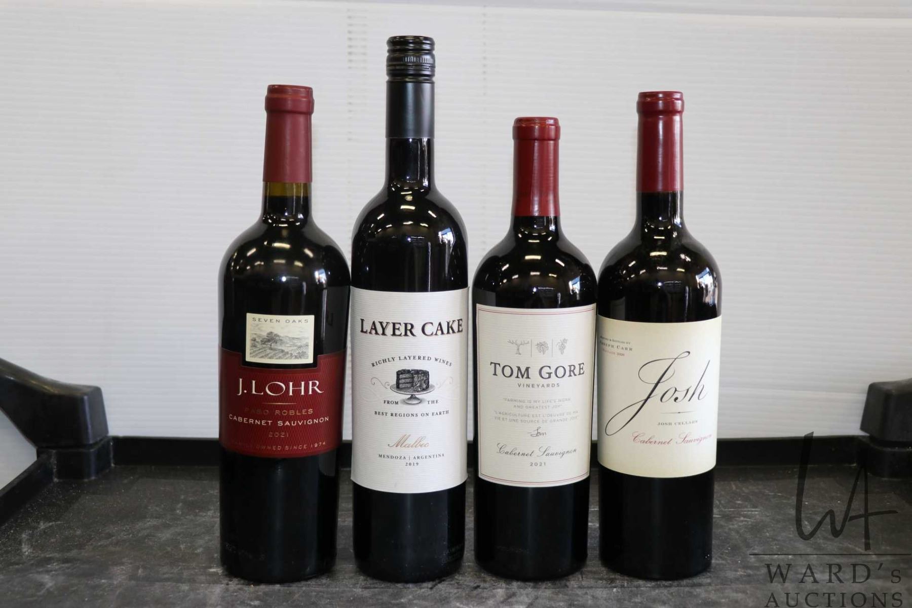 Four bottles of wine including J. Lohr Cabernet Sauvignon 2021 750ml / 13.9% ABV, Layer Cake Malbec 2019 750ml / 14.5% ABV, Tom Gore Vineyards Cabernet Sauvignon 2021 750ml / 13.5%, and a Josh Cellars Cabernet Sauvignon 2020 750ml / 13.5% Note: Alcohol cannot be insured by any courier in Canada. Local pick up is recommended. Canadian bidders only