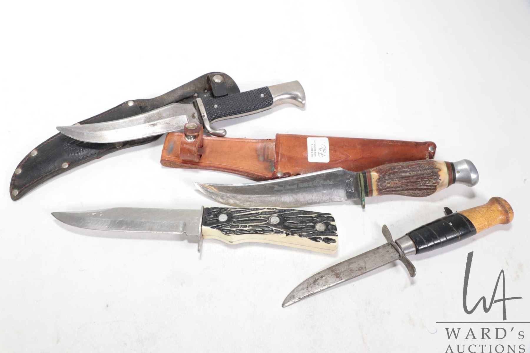 Four bucks knives including stag handled with leather sheath, Original Buffalo Skinner with leather