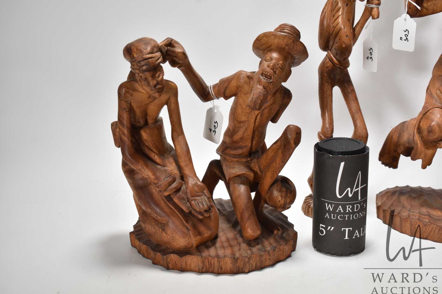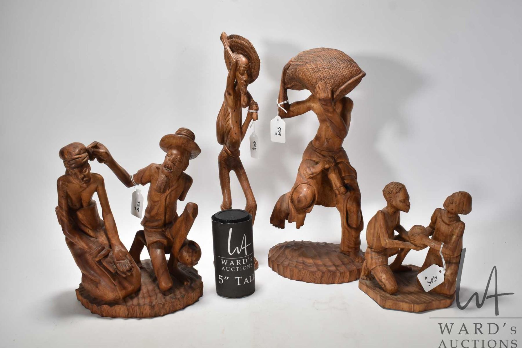 Four carved wooden figures including 16" man w/ sack, 11" man & woman, 8" two children and 17" tall thin man