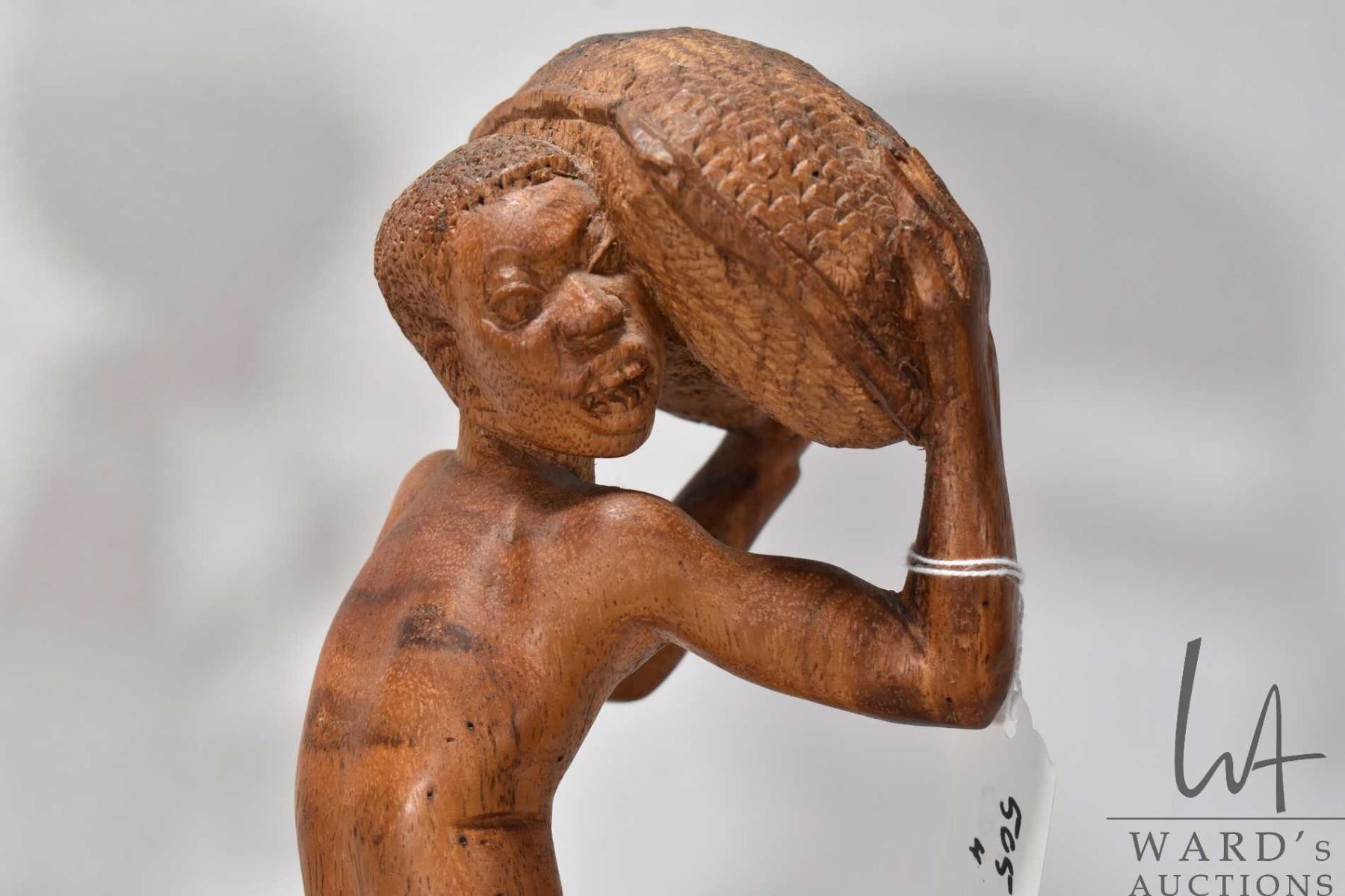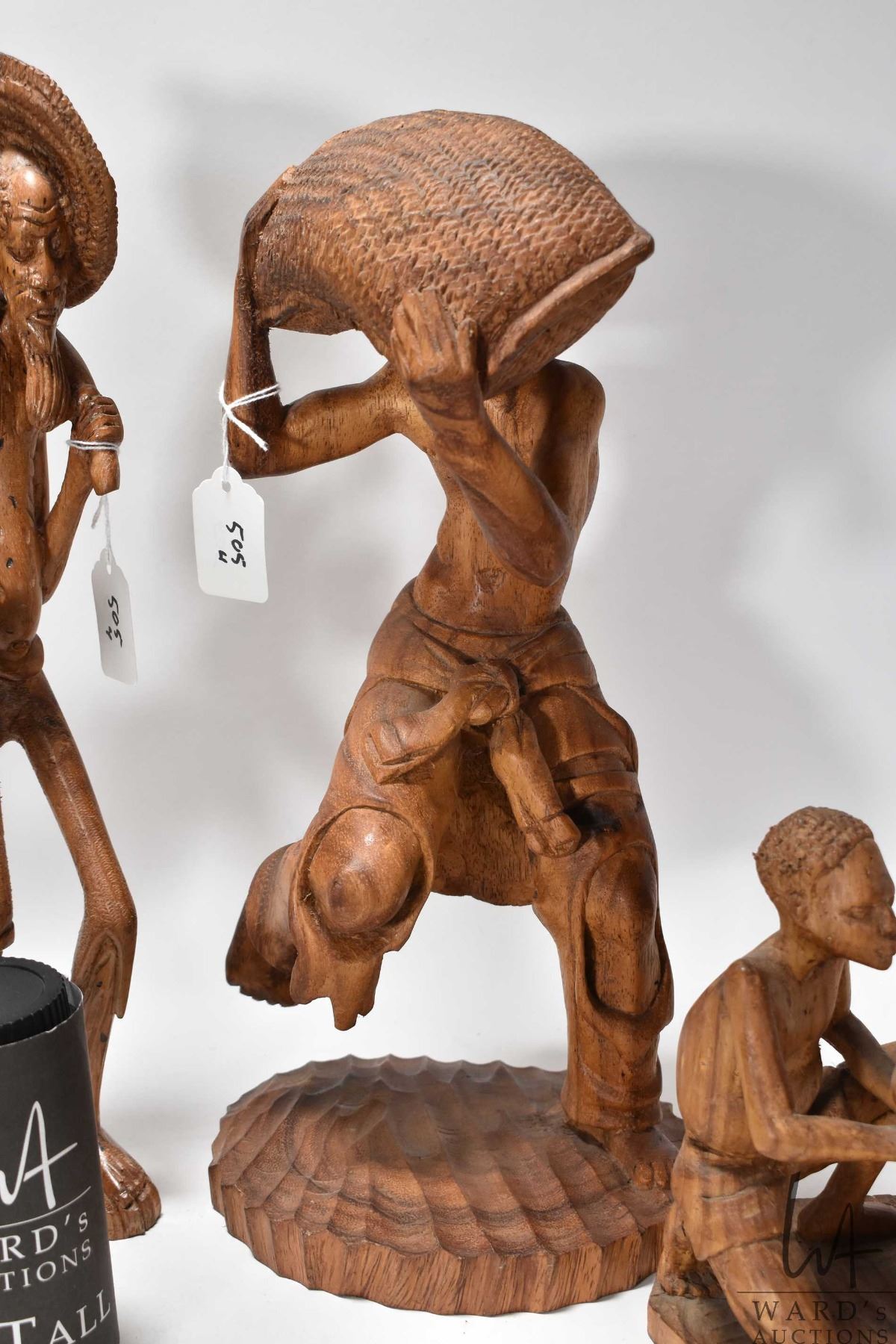 Four carved wooden figures including 16" man w/ sack, 11" man & woman, 8" two children and 17" tall