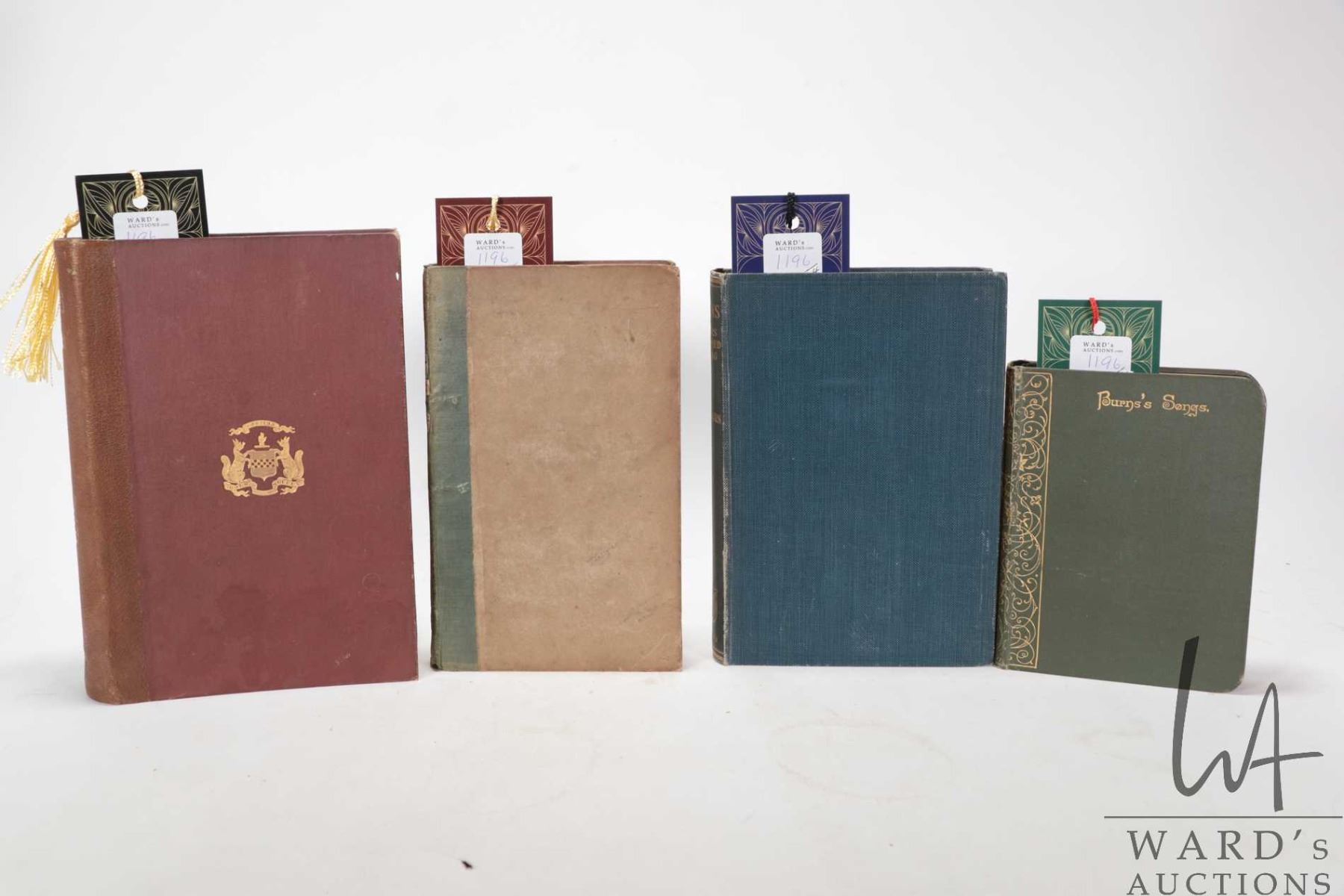 Four collectible books including " The Works of Robert Burns; with an account of his life, and a criticism on his writing" by James Currie M.D. Printed for Ogle, Allarice & Thomas and Stirling & Slade, Edinburgh 1820. ( appears to be volume II of a four volume set). Hardboard covers. "The Kilmarnock Edition of the Poetical Works of Robert Burns" Printed bu John Menzies & Co. Edinburhg and Glasgow, D. Brown and CO. Kilmarnock, 1890. Hardboard cover with decorative gold embossing. "Burn's Songs" Published by Walter Scott, London. Decorative gold embossed hardboard covers. " Burn's Poems Published in 1786" Printed At the Clarendon Press 1913. Decorative hardboard covers. Includes a newspaper clipping of an obituary of one of Robert Burns oldest friends, dated July 23, 1853.