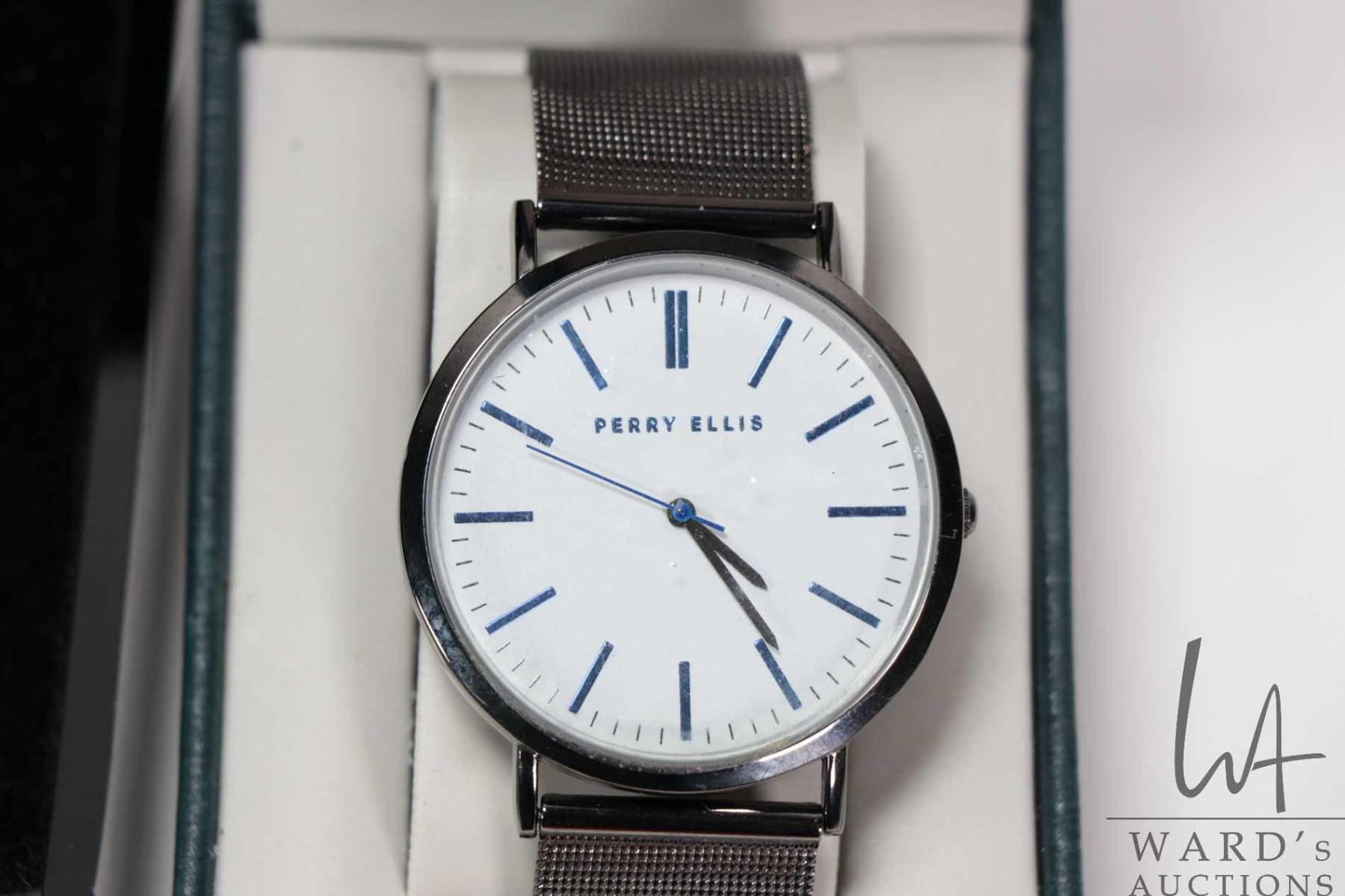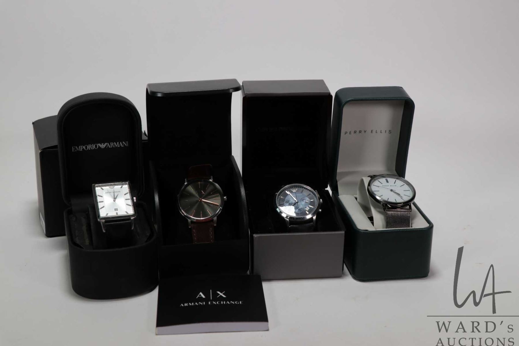 Four collectible gent's wrist watches, two marked Armani Exchange, a Emporio Armani and a Perry Ellis, all quartz battery movements, one working at time of cataloguing