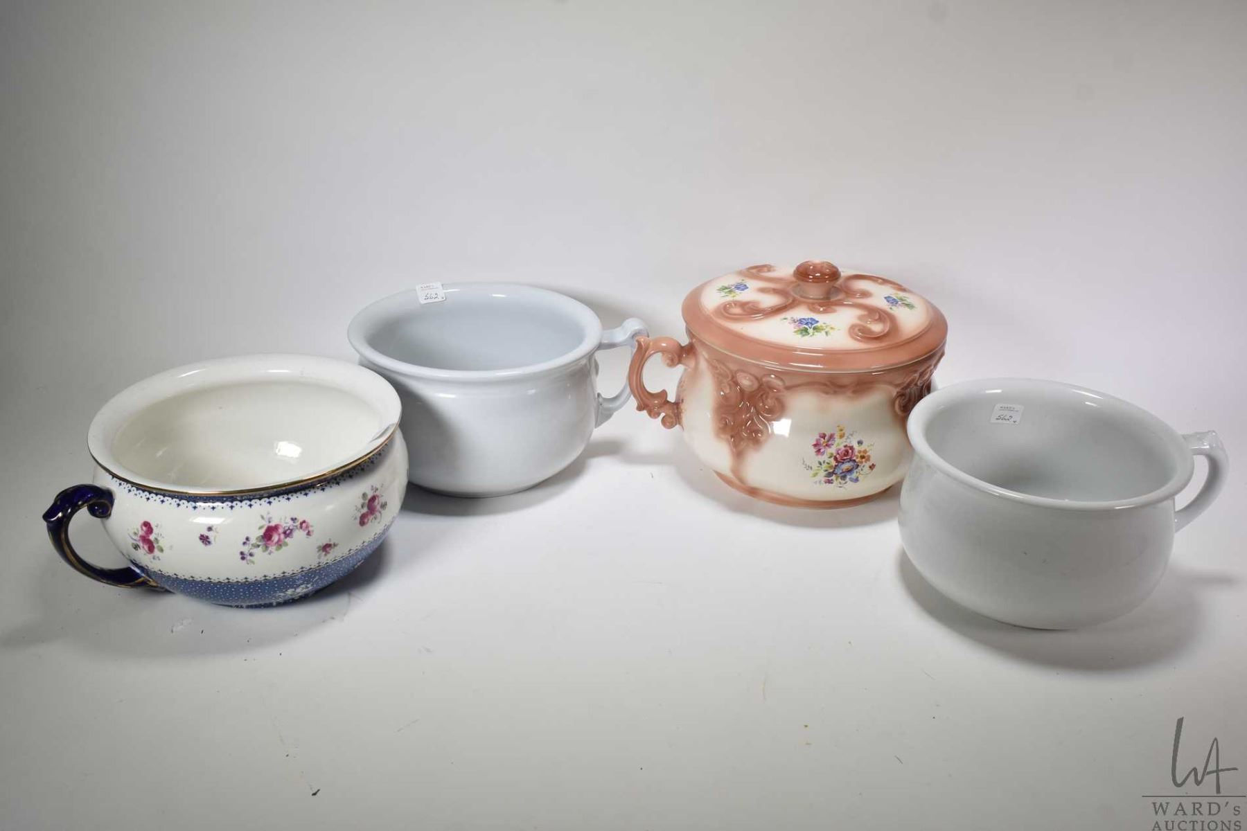 Four commodes including Wedgwood & Co., Alfred Meakin, Johnson Bros. plus a lidded ceramic commode