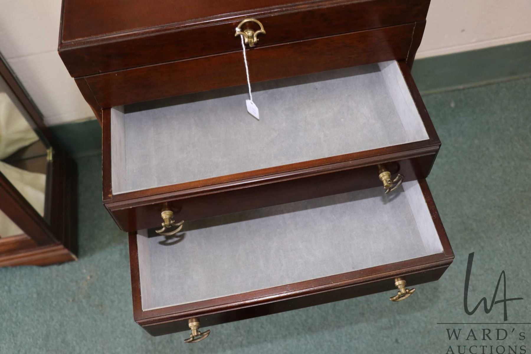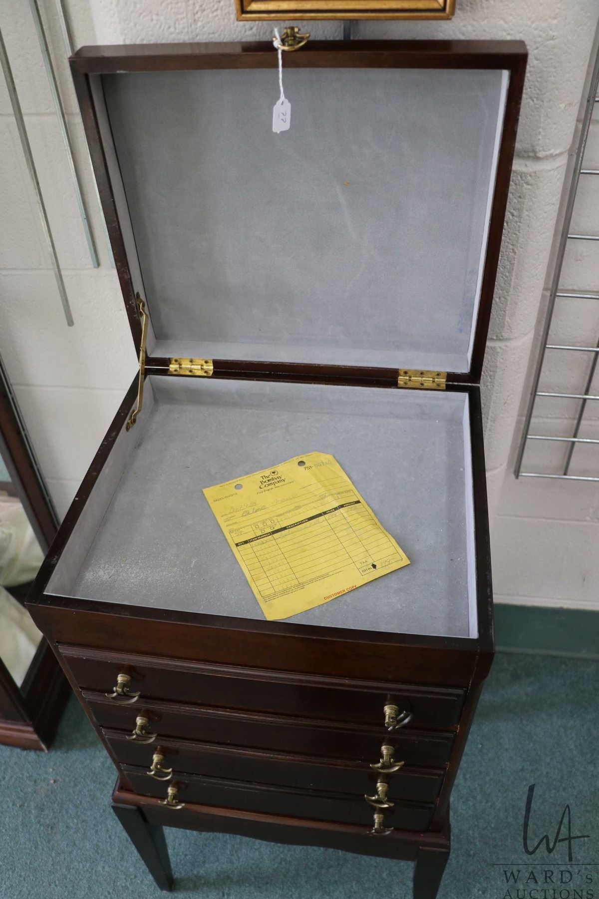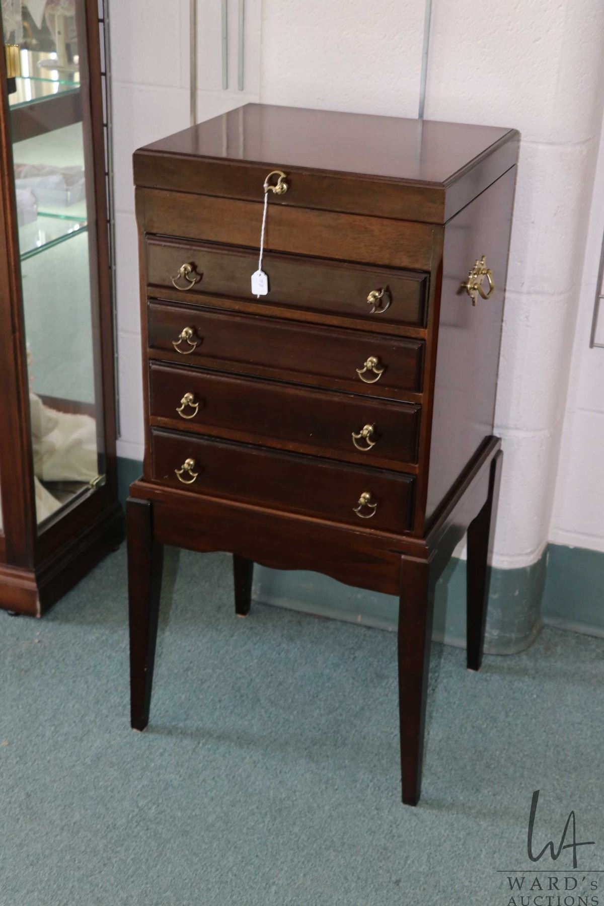 Four drawer, flip up lid flatware case made by the Bombay Company, note: chest is on separate stand, 32" in height for both pieces