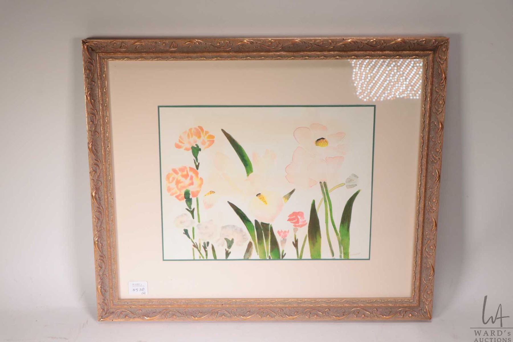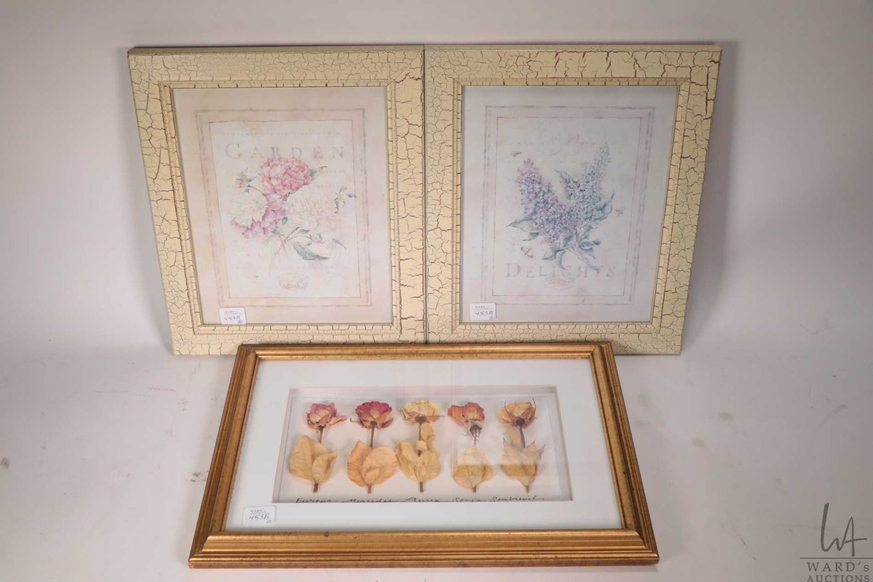 Four framed artworks including original watercolour floral signed by artist, 8" X 11", gilt framed dried rose collage, and two botanical prints