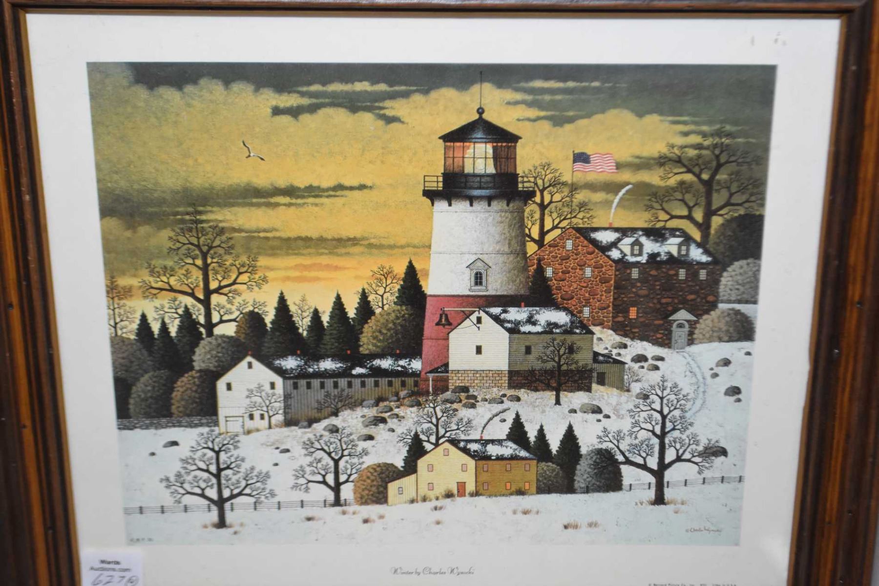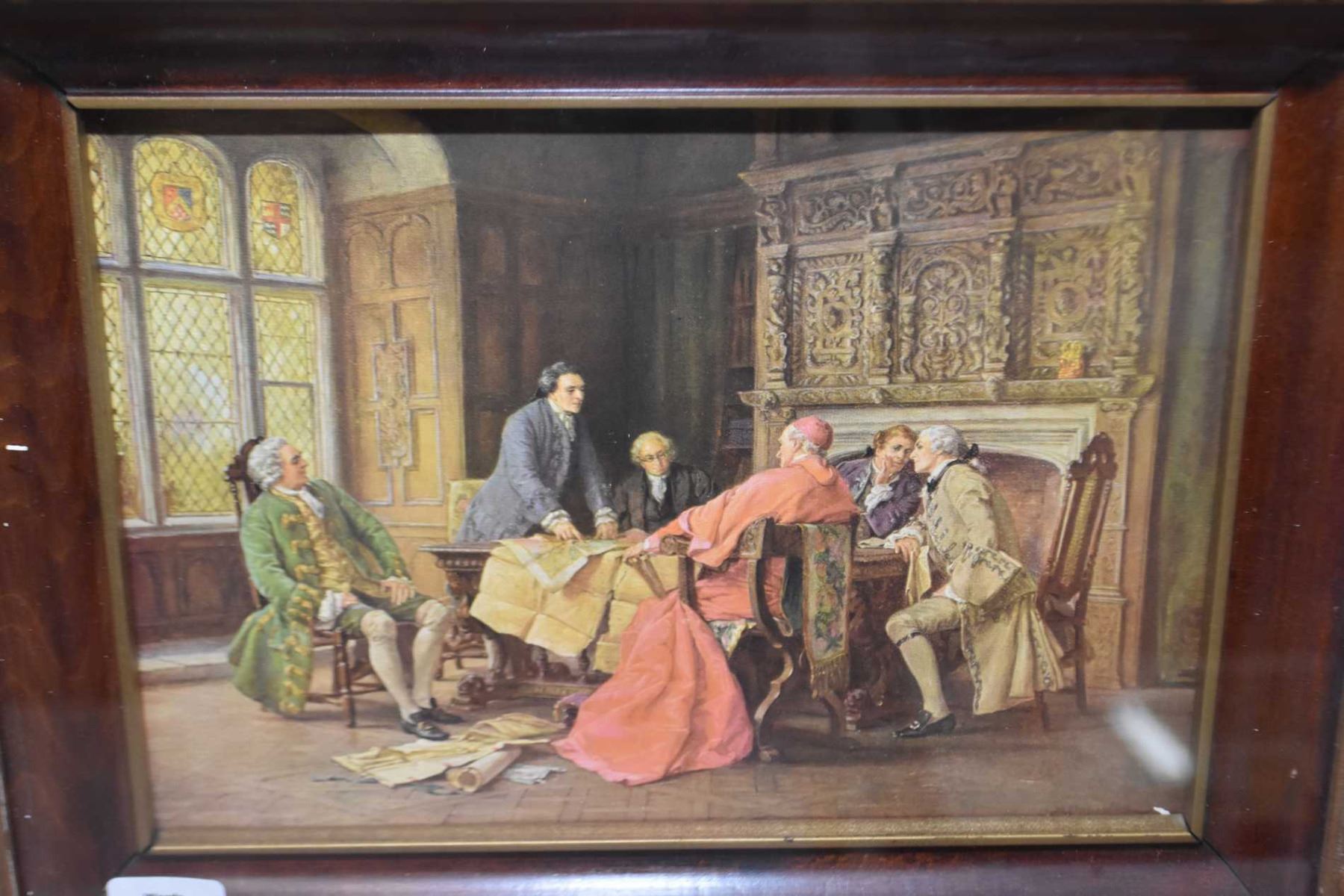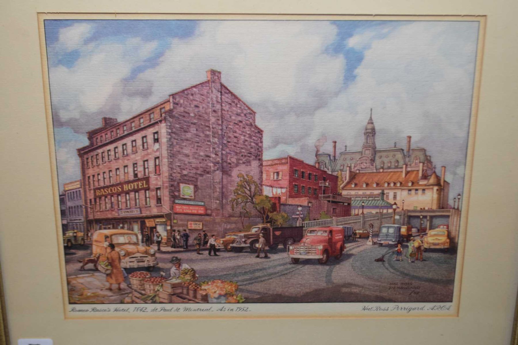 Four framed prints including shadow boxed meeting with a cardinal, Sacre Coeur church in Paris, "Winter by Chalres Wysocki" and "Roman Rasco's Hotel 1842, St. Paul's street Montreal"