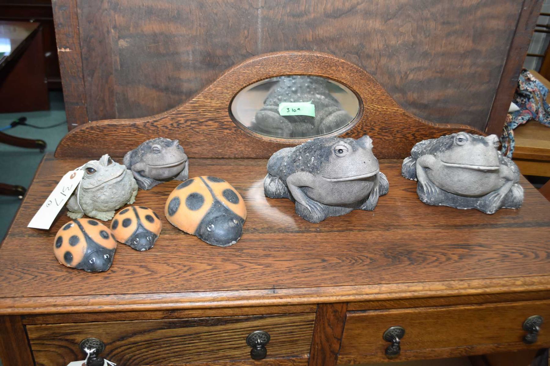 This Item Not Available For Shipping. Local Bidders Only. Four garden frogs and a lady bug picnic