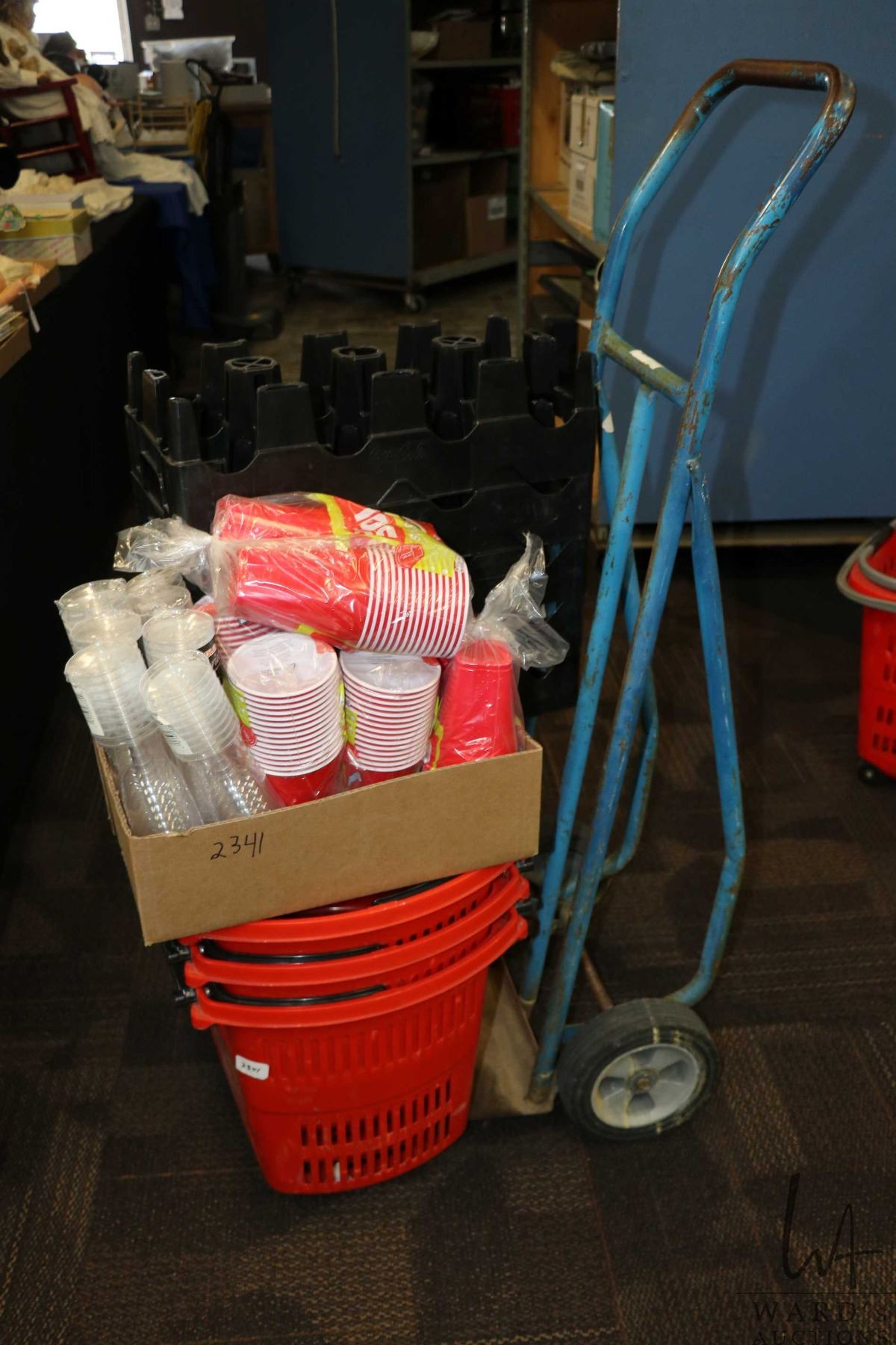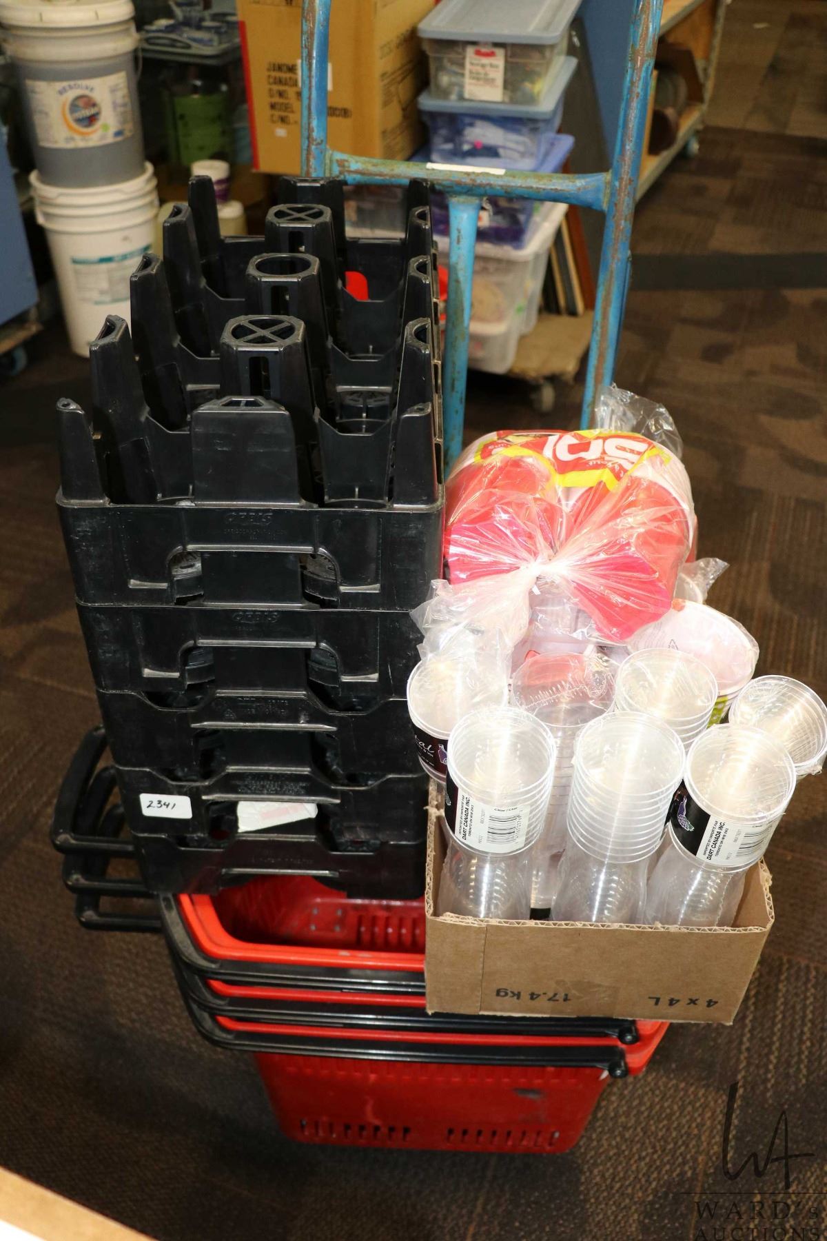 Four grocery totes, selection of plastic wine glasses and cups, two wheel cart, etc