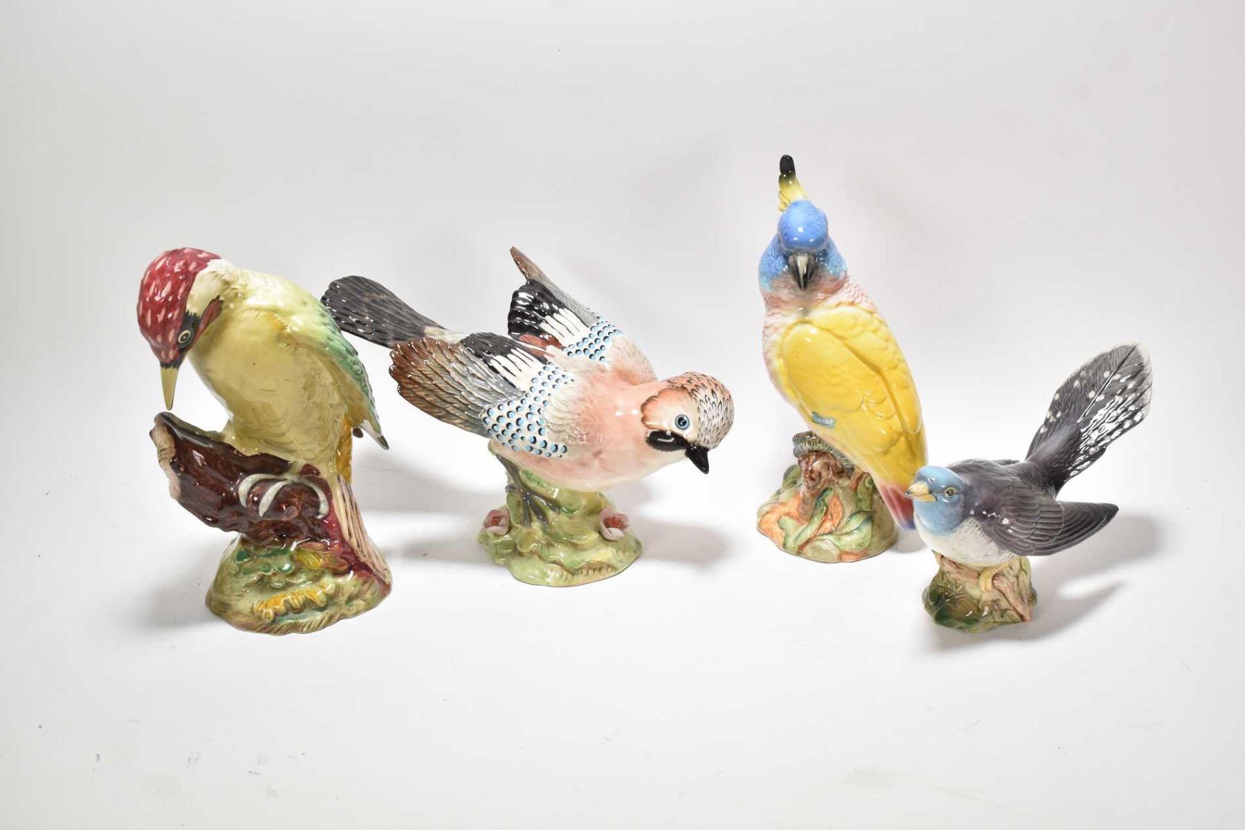 Four large Beswick birds including Woodpecker 9" in height, Cockatoo, Jay etc.