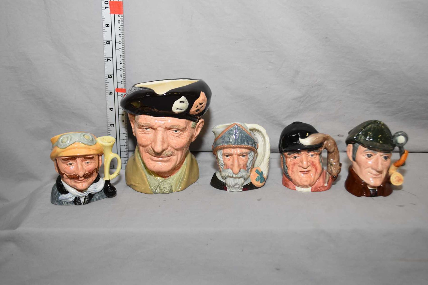 Four medium Royal Doulton character jugs including The Sleuth D6635, Don Quixote D6460, Gone Away D6538, Veteran Motoris D6637 and a large jug Monty D6202