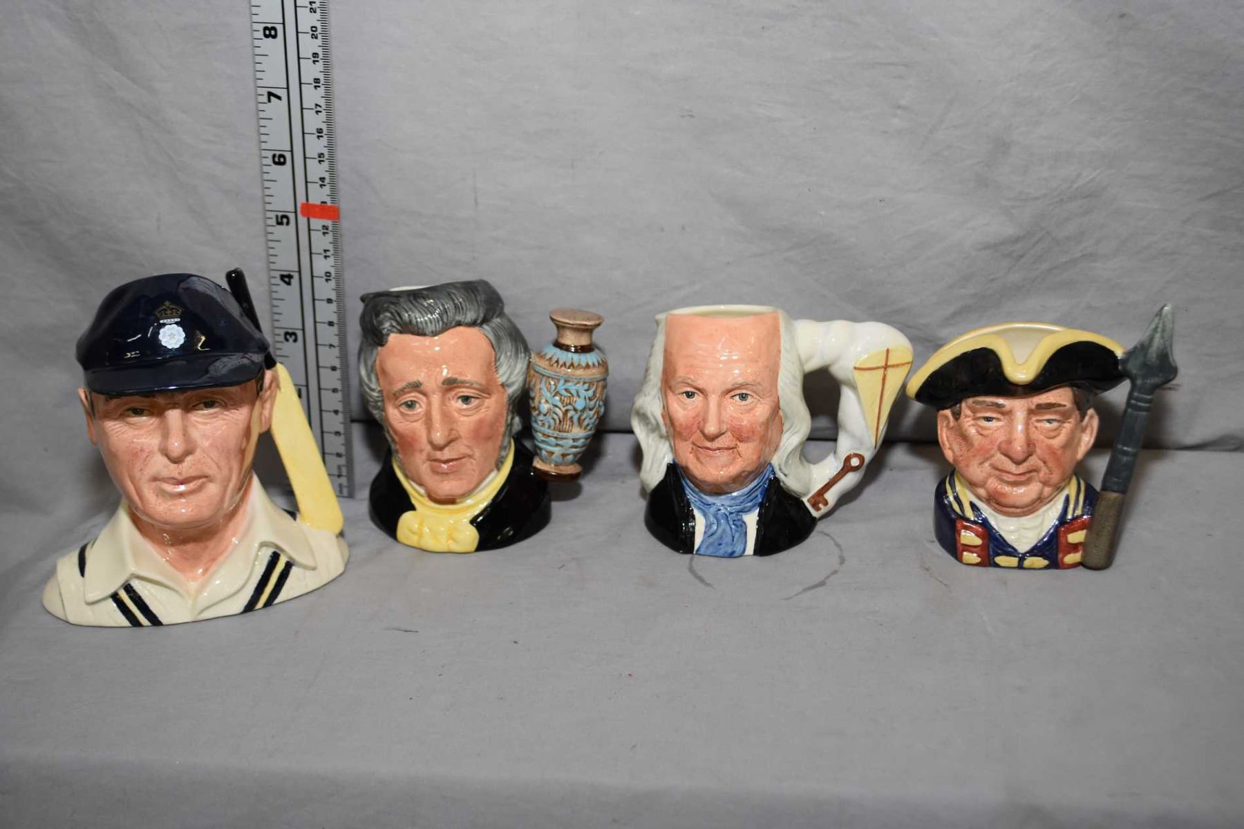 Four medium sized Royal Doulton character jugs including Benjamin Franklin D6695, Sir Henry Doulton D6703, The Hampshire Cricketer D6739 and Guardsman D6575