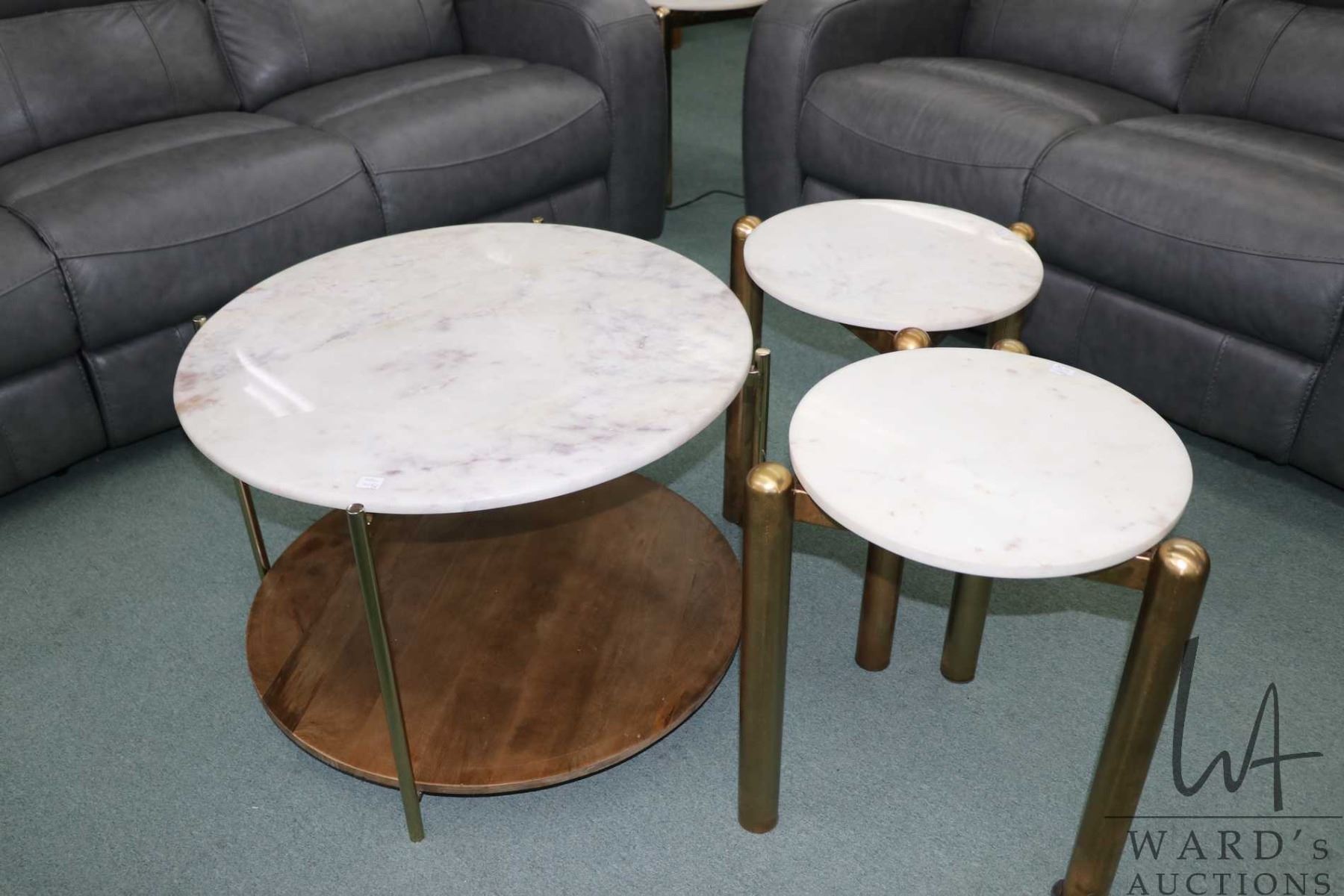 Four modern marble top occasional tables including three 21" H X 16" D side table plus similar styled coffee table 20" H X 28" D