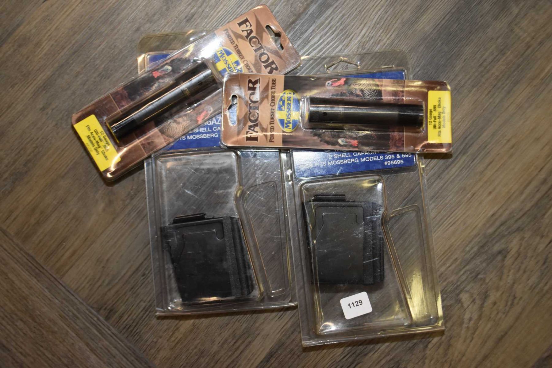 Four new in package Mossberg firearms accessories including two model 695 .12 ga magazines part no. 95695 and two Accu-mag chokes no. 95258