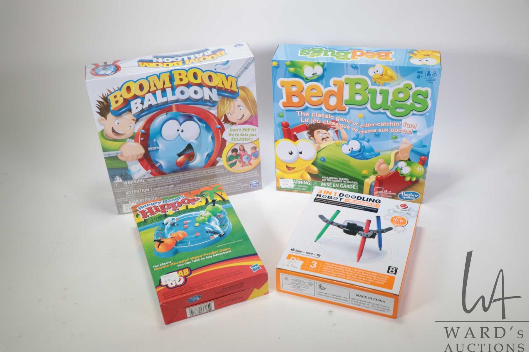 Four new in package toys including Boom Boom Balloon, Bed Bugs, Hasbro Hungry, Hungry Hippos and a 3 in 1 Doodling Robot