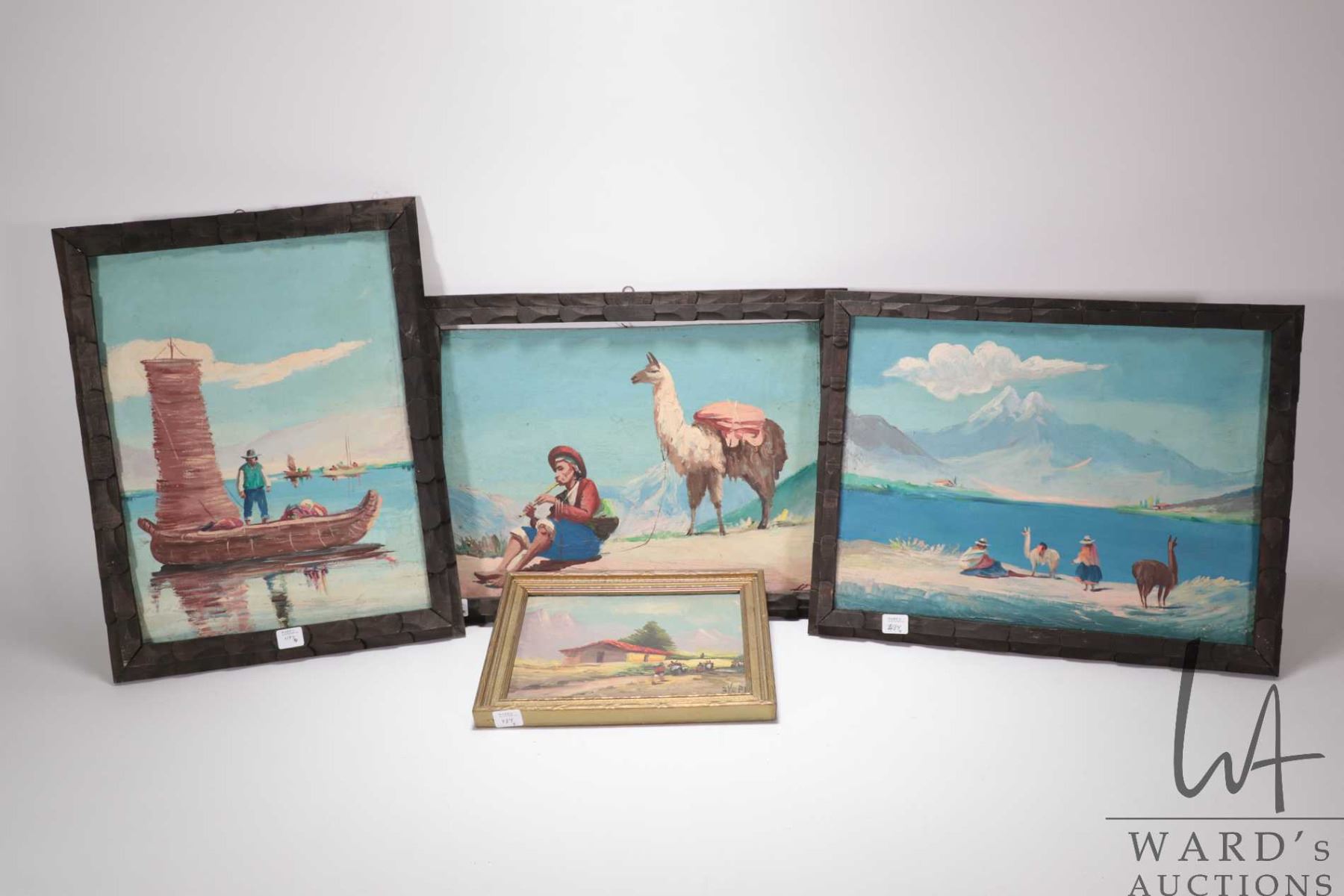 Four original paintings each Peruvian in motif including Alpacas, boats etc, 11" X 15" and 7" X 9". Note: Artwork shipments cannot be insured. Local pickup recommended