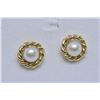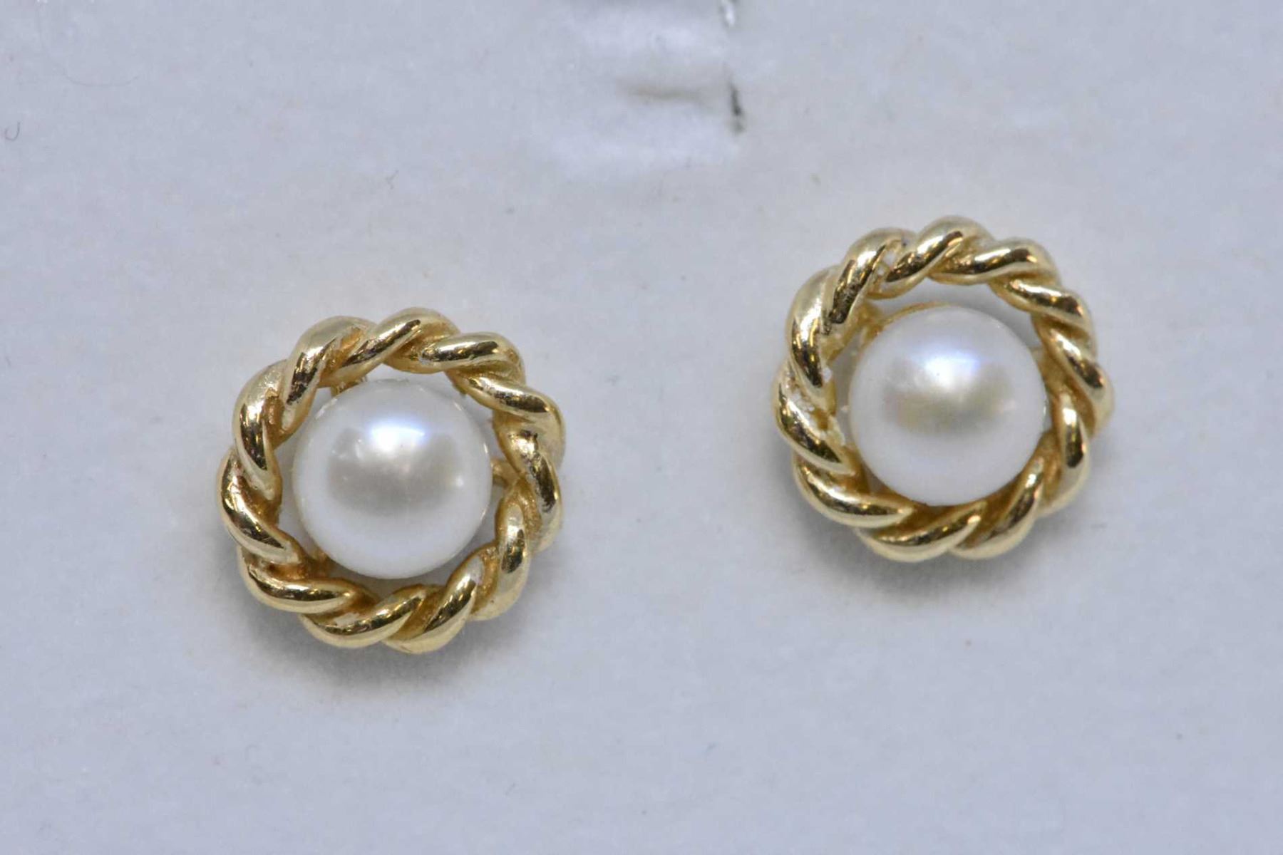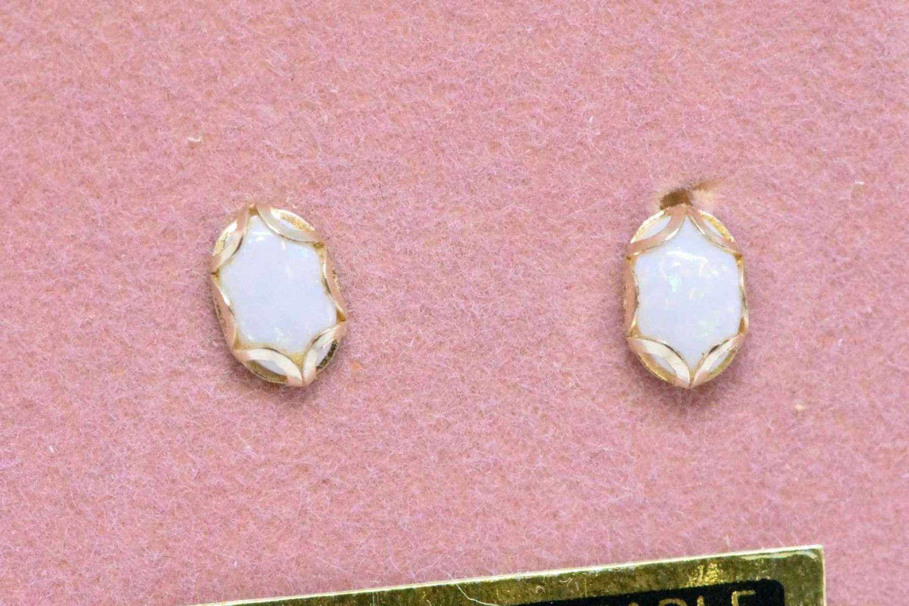 Four pairs of yellow gold earrings including 18kt gold hoops, pearl 14kt heart shaped earrings, 10kt genuine pearl and 10kt genuine opal earrings